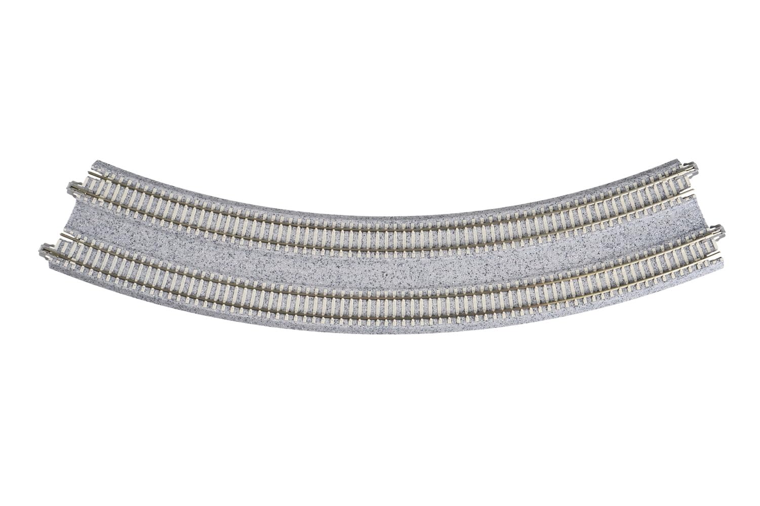 N Scale The next stage in realistic snap track - 'Superelevation' is the term used to describe track in which one rail is higher than the other, much like a banked curve on a freeway offramp or a high speed corner in NASCAR, these banked curves are specially designed to reduce wheel wear and increase both comfort and safety in all manner of trains, fast or slow, passenger and freight. These superelevated curves are a standard installation in modern railroads, and before now they were complicated and finicky to replicate at model railroad scale level, but no longer! Kato UNITRACK makes it simple with modular easement and superelevated curves, available with modern pre-cast concrete ties (which not only modernize the look of your rails, but help differentiate the pieces at a glance from non-banked track pieces). Please note that all of these Concrete Tie Double Track pieces are 100% compatible with our regular double and single track Unitrack pieces and bridges and can be added into your existing Unitrack layouts!