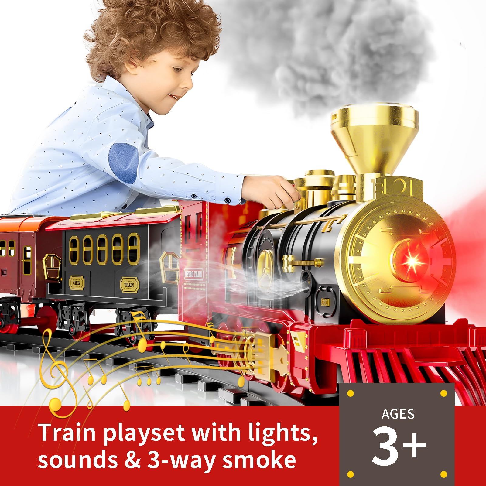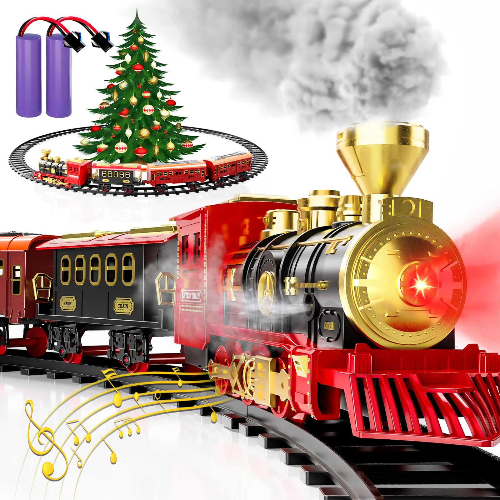 Christmas Tree Train Set With 2 Rechargeable Battery, 3 Way Smoke Locomotive, Light And Sounds, Large Electric Train Set For Under Christmas Tree, Holiday Decor Model Trains Toys For Kids Toddler Birthday Thanksgiving Christmas Gifts Presents - Red Classic Toy Train Set For 3 4 5 6 7 8 9+ Years Old Boys Girls Gift Presents