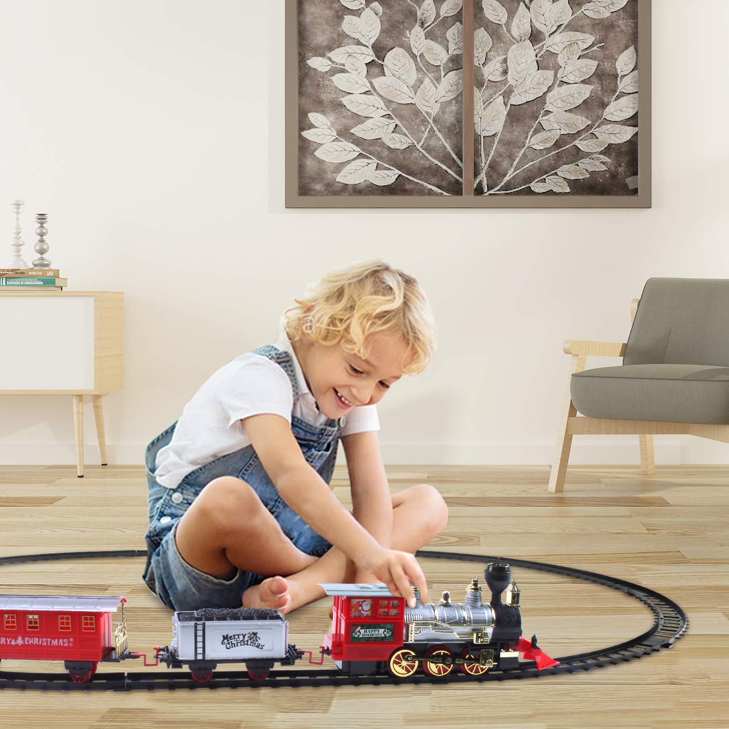 This Electric Christmas Train Set Includes 1 Red Battery-Operated Locomotive, 1 Silver Coal Tender, 1 Red Compartment, 8 Curved Tracks And 2 Straight Tracks. The Locomotive Is 10’’ In Length, 2 Compartments Measure 6’’ And 8’’ Long, Respectively. The Total Length Of The Tracks Is Over 11’. Play Is The Path Kids Take To Learning. This Classic Toy Train Set Can Help Your Kids To Expand Their Cognitive, Social, Emotional, Language And Motor Abilities.