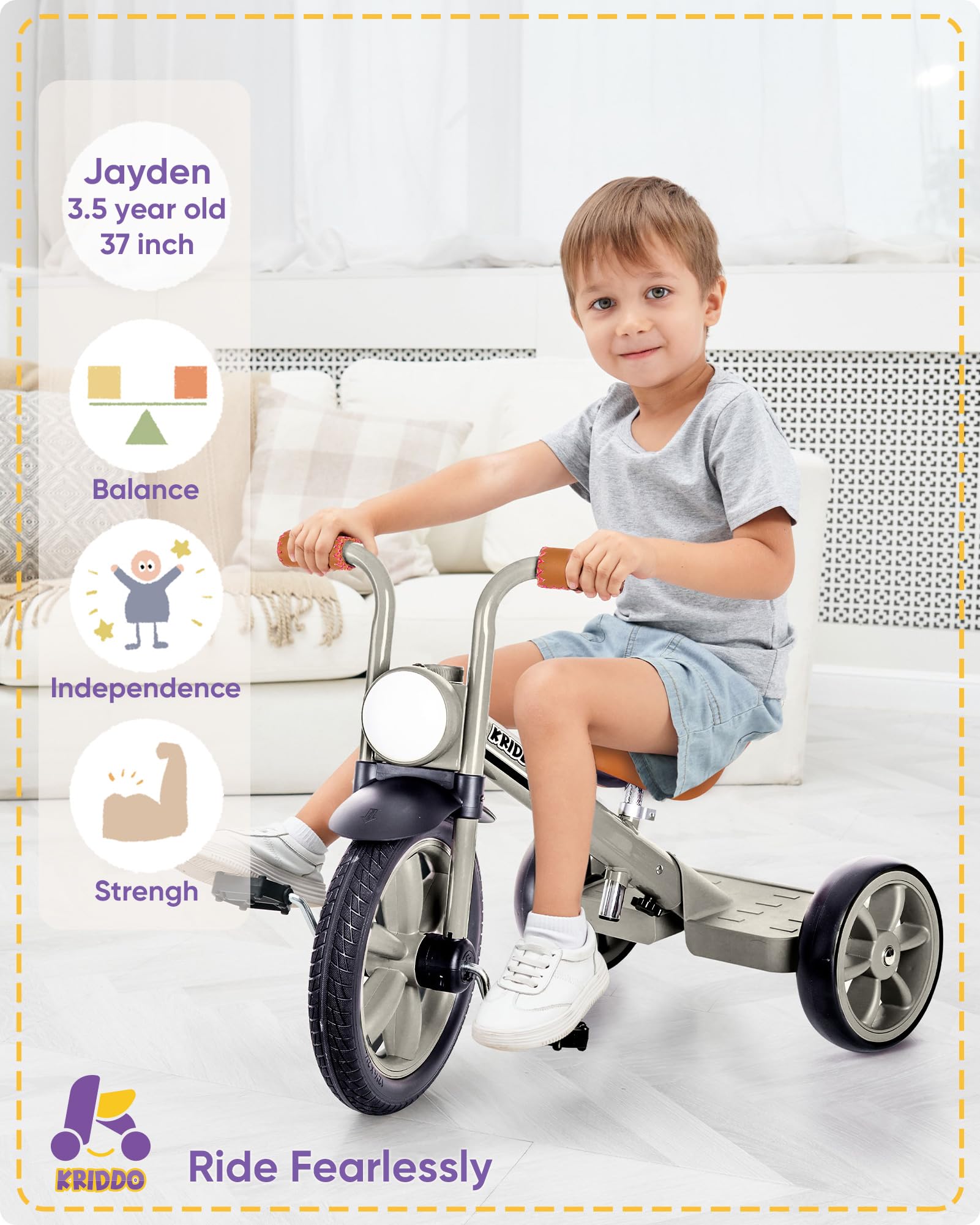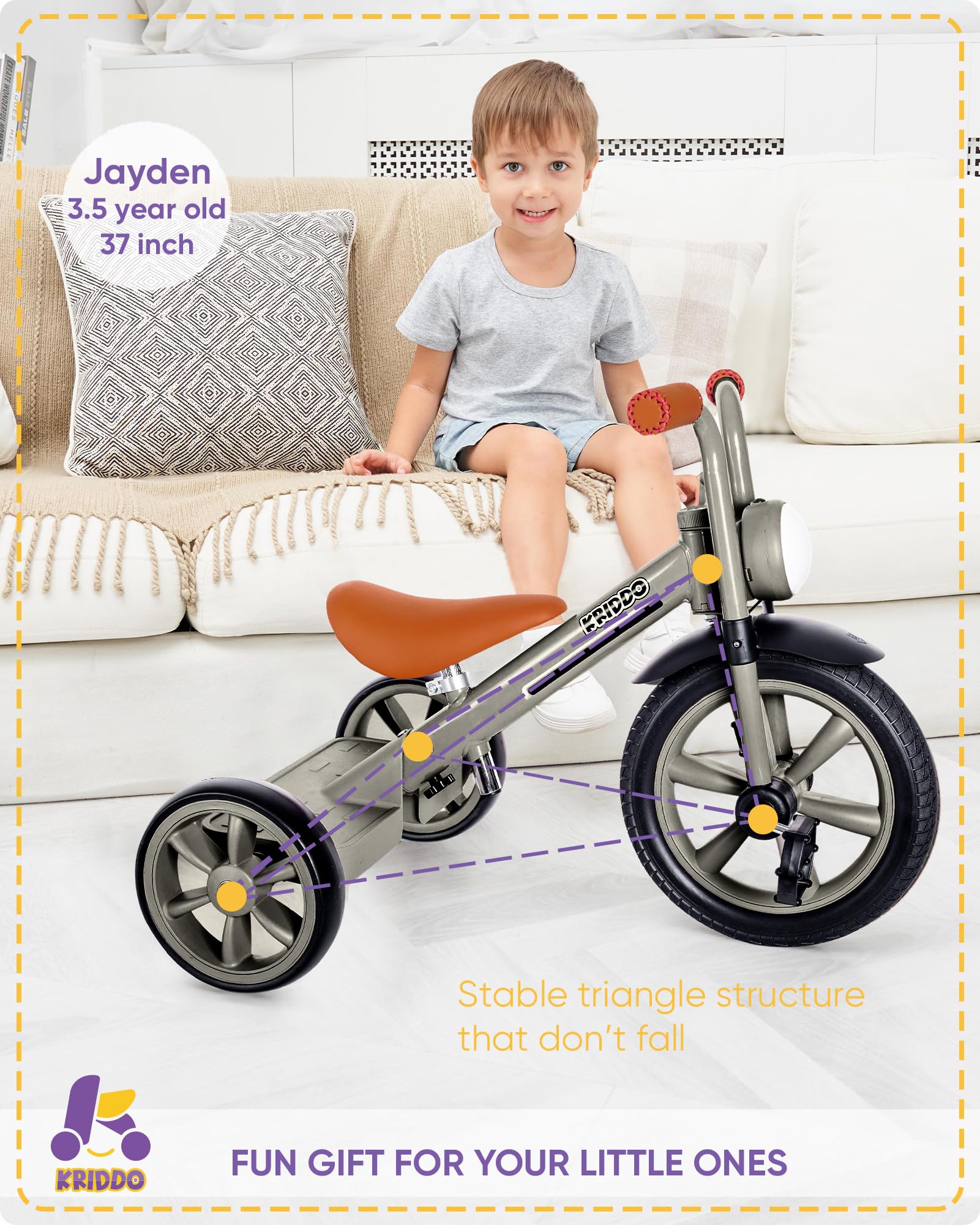 KRIDDO Kids Tricycles Age 2 Years to 5 Years, 12 Inch Puncture Free Rubber Wheel w Front Light, Kids Trike for 2.5 to 5 Year Old, Gift Toddler Tricycles for 2-5 Year Olds, Trikes for Toddlers, Grey