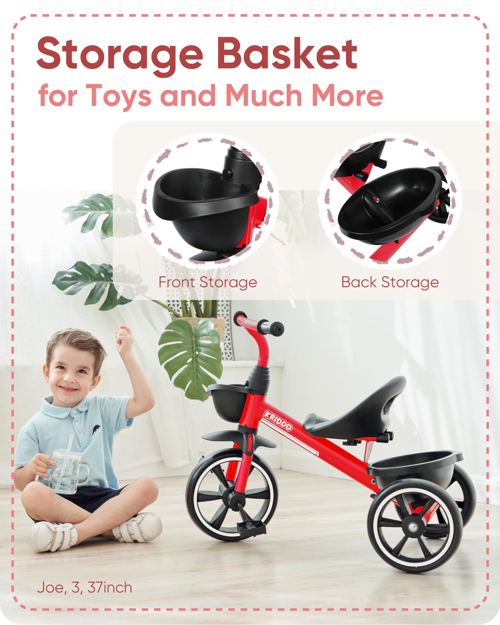 KRIDDO Kids Tricycles Age 24 Month to 4 Years, Trike for 2.5 to 5 Year Old, Gift Tricycles for 2-4 Year Olds, Trikes for Toddlers, Red