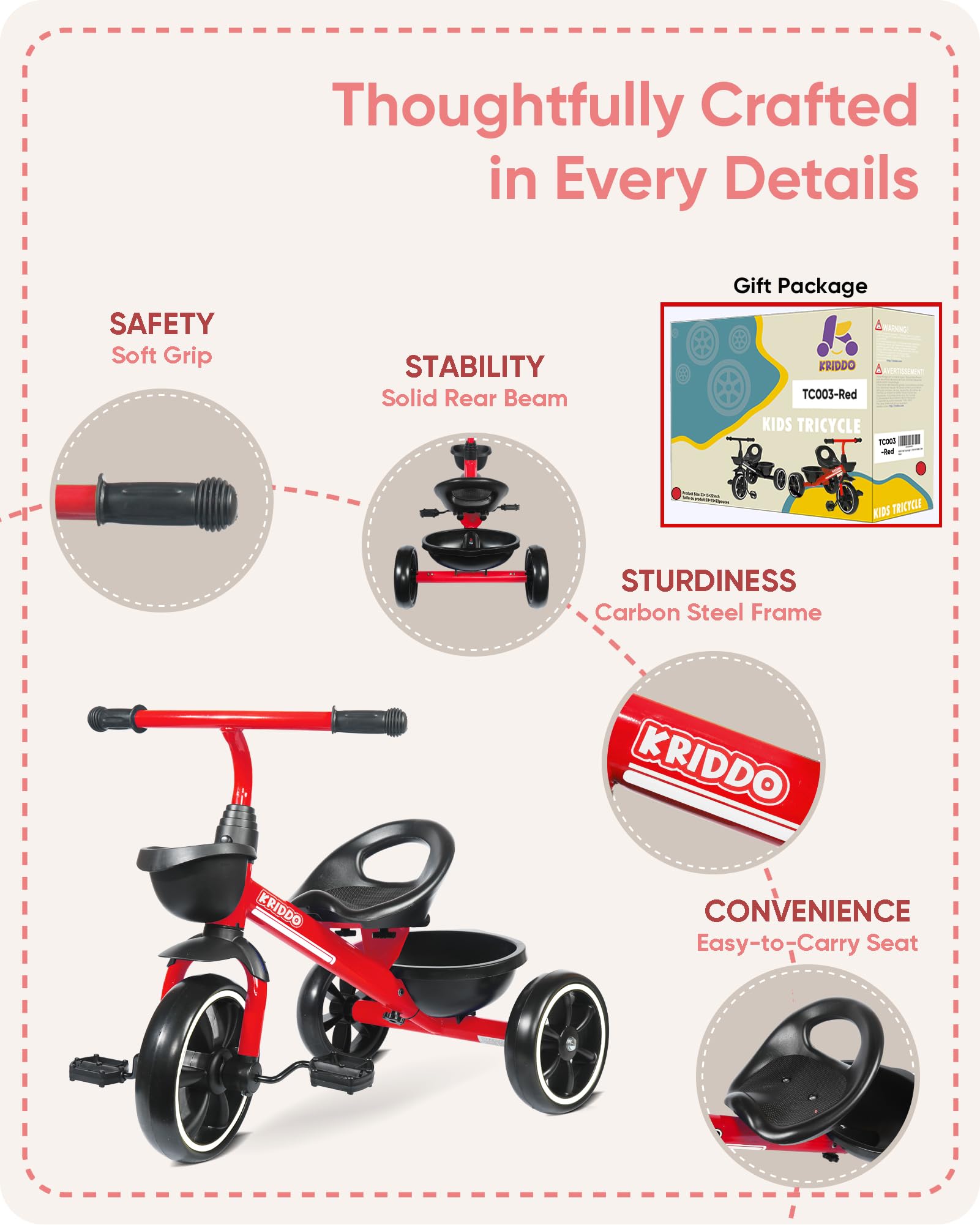 - Q: What safety features does the KRIDDO Kids Tricycle have? A: The KRIDDO Kids Tricycle includes a smart triangular design with extended rear wheels and a wider wheelbase, which helps prevent tipping or rolling over while your child learns to ride. It is made from high-quality, BPA-free materials and conforms to American toy safety standards.