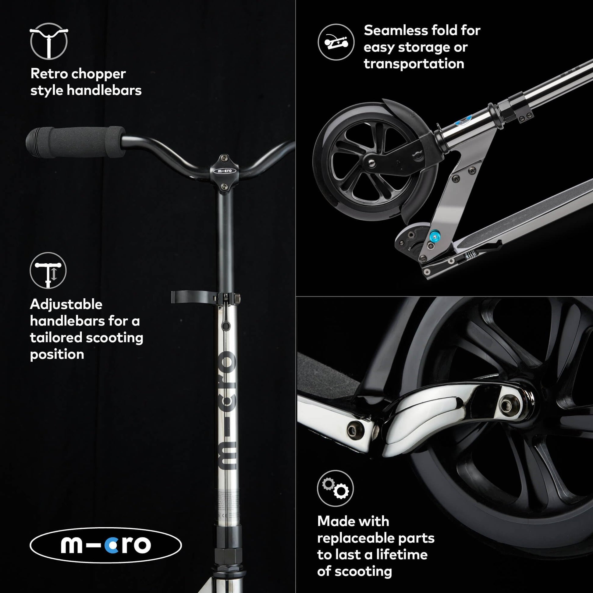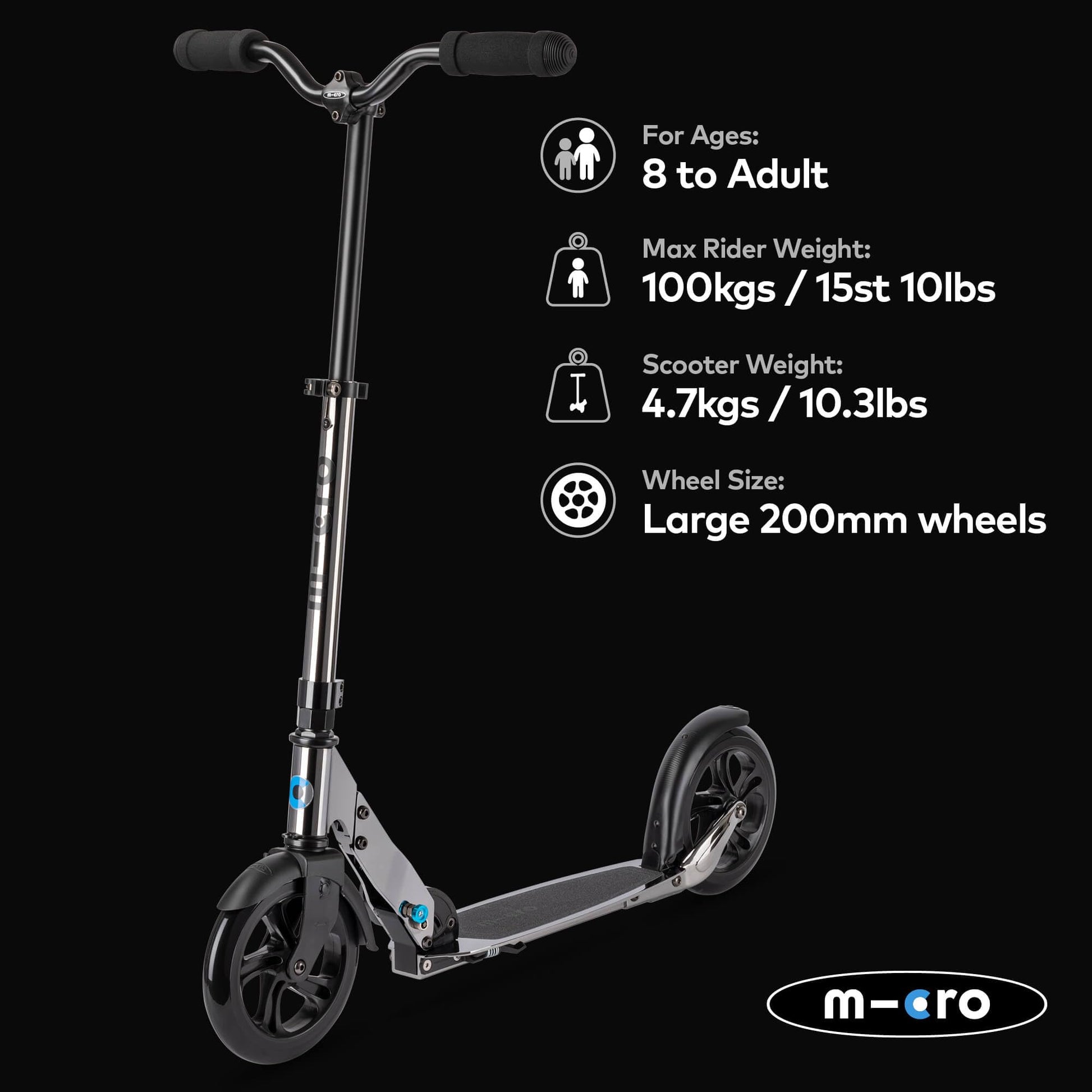 COMMUTE COMPANION - Our Micro Classic has introduced millions of mature-themeds to the world of scooting. | ADJUSTABLE HANDLEBARS - The Micro Classic's handlebars can be adjusted from 72cm to 103cm high to suit any rider. | LARGE WHEELS - Our 200mm wheels are the perfect balance. Large enough to glide effortlessly and small enough to fold into a compact package. | CONVENIENCE - Designed for on - the - go convenience with adjustable handlebars a seamless folding mechanism and kickstand for independent standing. | HIGH STABILITY - Our footplate is low to the ground. Long wide and ridged. It delivers a more stable lower impact less strenuous ride.