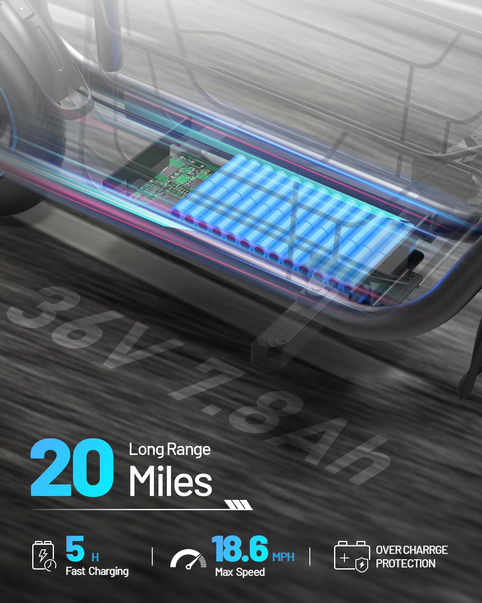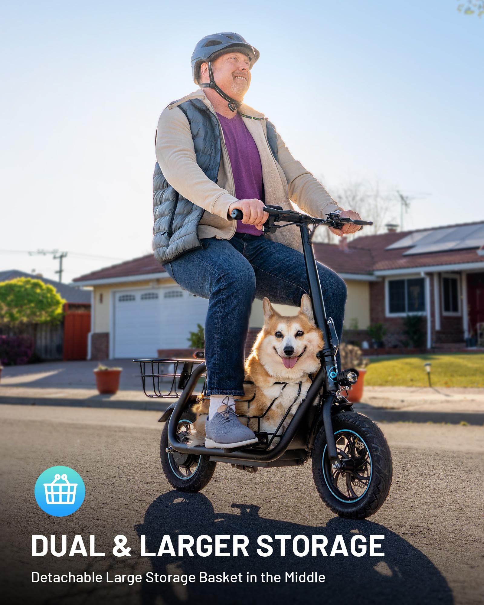 Outstanding Performance: This electric scooter features a 550W motor and durable battery traveling at speeds of up to 18.6 miles per hour for 20 miles. Adjustable seat suitable for passengers from 5 feet 1 inch to 6 feet 1 inch. Soft and breathable seat ensures a comfortable ride even on long journeys. | Spacious Storage: With a large detachable middle basket and a small rear basket this scooter provides ample storage for effortless transportation of large items. Wide deck: The 9.5-inch wide deck offers plenty of space for your feet or even small pets. Shock-absorbing tires: Equipped with thick and sturdy 12-inch tires absorbing most shocks for a smooth and comfortable riding experience. | Safety First: High-brightness front headlight and rear brake light ensure visibility and safety during night rides. Dual disc brakes: Effective dual-disc braking system offers excellent stability and control for progressive and safe stops. limited availability pole lock: Prevents accidental displacement of the stem enhancing safety. | Portable and Durable: Foldable handlebars: Foldable handlebars make this lightweight scooter easy to store and carry convenient for transportation in luggage or public transport. Sturdy structure: Made of sturdy and durable metal body capable of supporting a maximum weight of 265 pounds. | Digital Display: The LCD display provides real-time information about battery level current speed speed mode single mileage and total mileage ensuring you stay informed during your journey. Clear screen: The screen remains clear even in sunlight avoiding any inconvenience during riding. Safety certification: This product has passed UL2272 certification ensuring it meets strict safety standards.