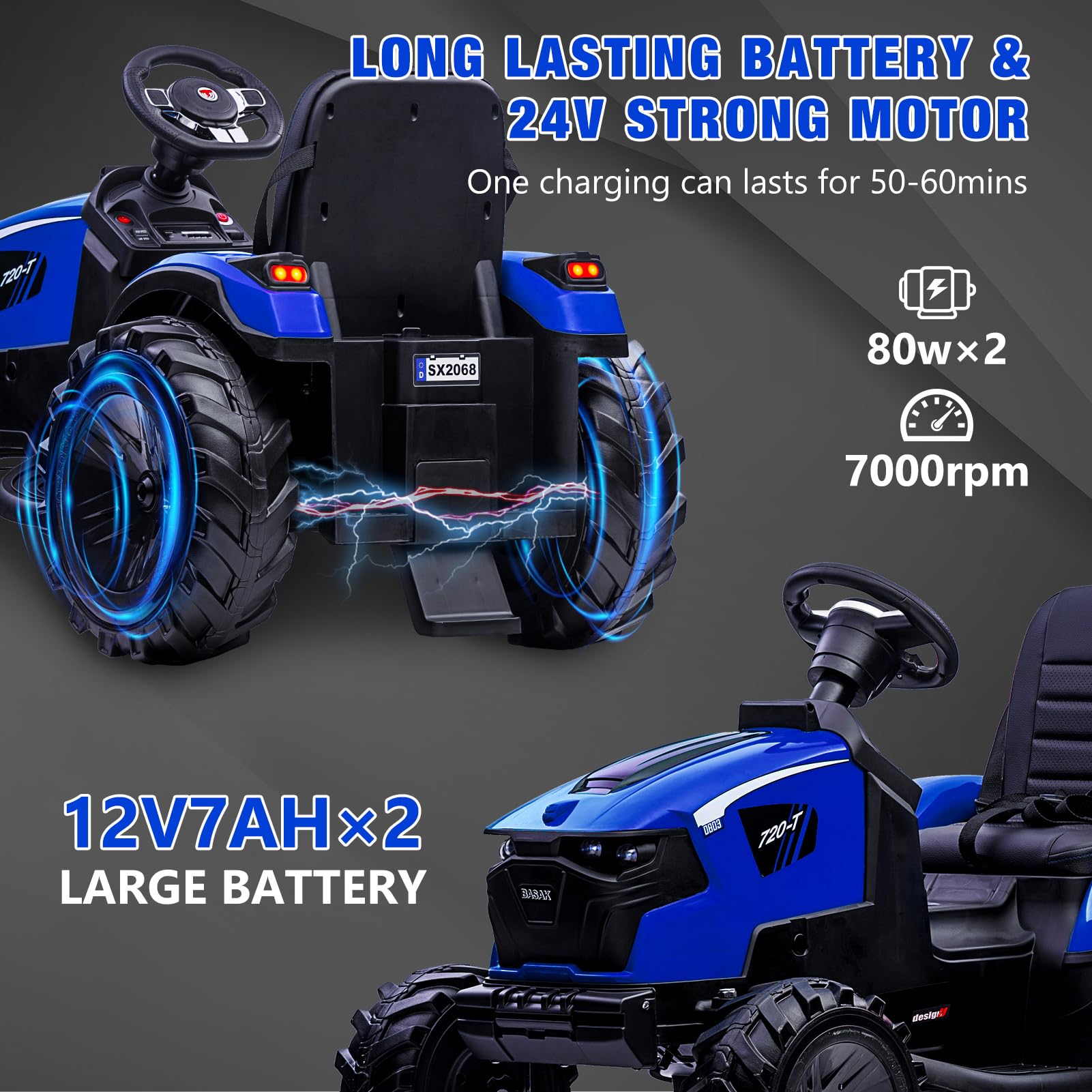 3-in-1 Multi-Functional Tractor - Real Farm Adventures! Watch your little farmers imagination come to life with this amazing 24V ride on tractor that transforms between three realistic modes - tractor, bulldozer, and excavator! Designed for big kids ages 4-8, this versatile kids electric car features detachable attachments, a 180