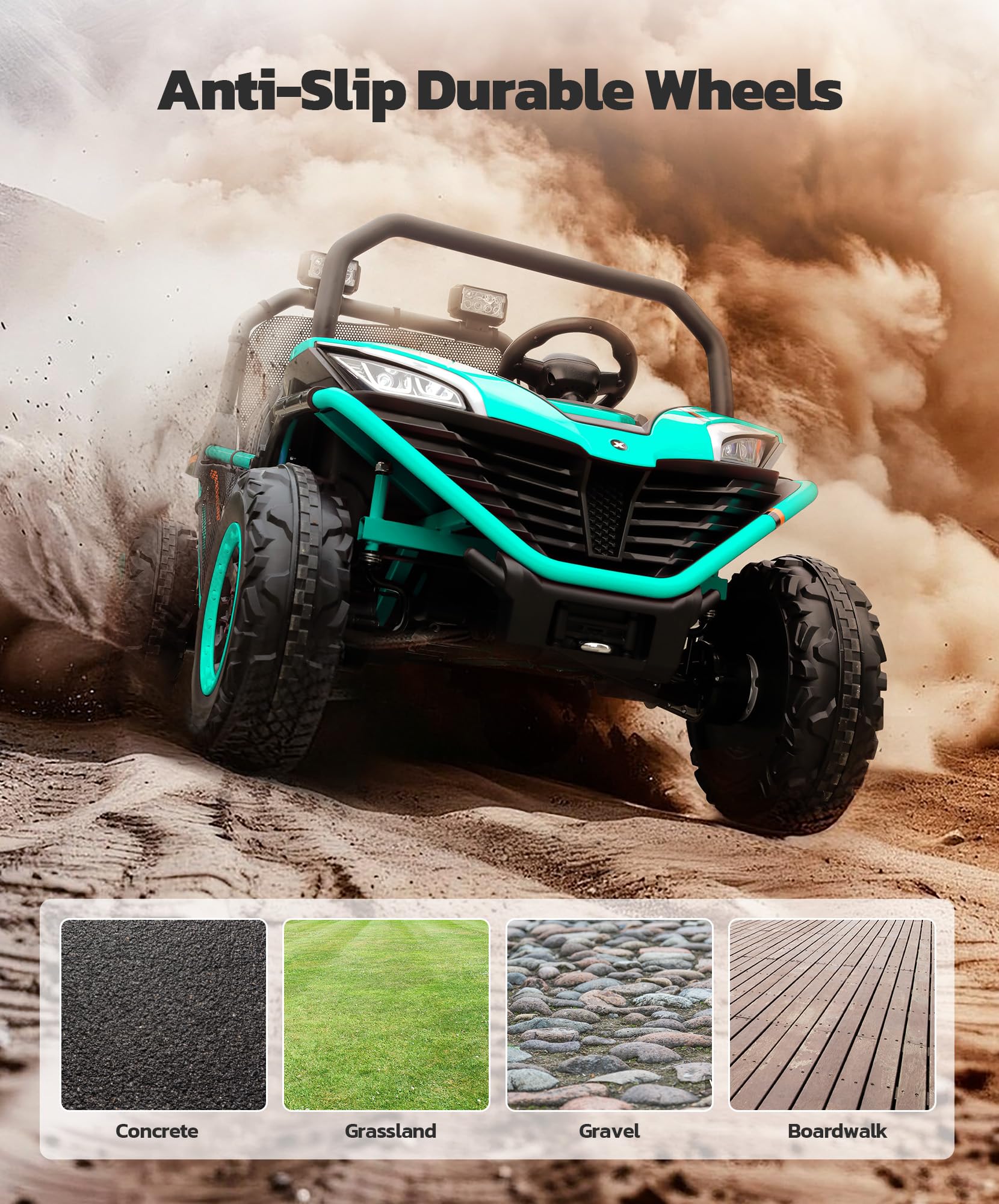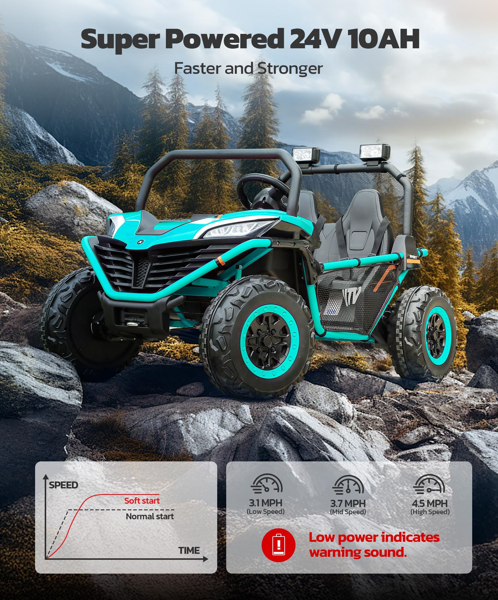 Wider 2 Seater:ELEMARA 2 seater features a 20inch two-seater design for maximum stretch. With dimensions of 48.2*31*31.5 inch and a weight capacity of up to 140 lbs, your children can bring their | Powerful 24V 10AH Battery:Equipped with a 24V 10AH battery and a 4*45W motor, our electric vehicles offer longer play times, lasting 90 minutes on a full charge. When the battery is low, the voice | Dual Modes: Children drive themselves and experience the thrill of driving at speeds of 3.7/4.5 miles per hour. After parents match the remote via M, adjust the speed (3.1/3.7/4.5 MPH) while the | Sturdy Metal Structure Dual Protection: Our ride on car features a robust metal body and bottom, tested over 200 times for durability. It also comes with two large springs for cushioning during | Music and Lights: This car is not just about the ride - its also a party on wheels! With a built-in radio, MP3 player, USB connectivity, and the ability to search for YX to connect via