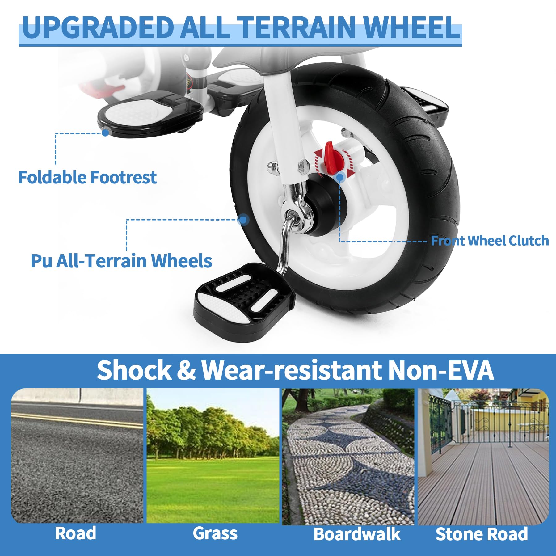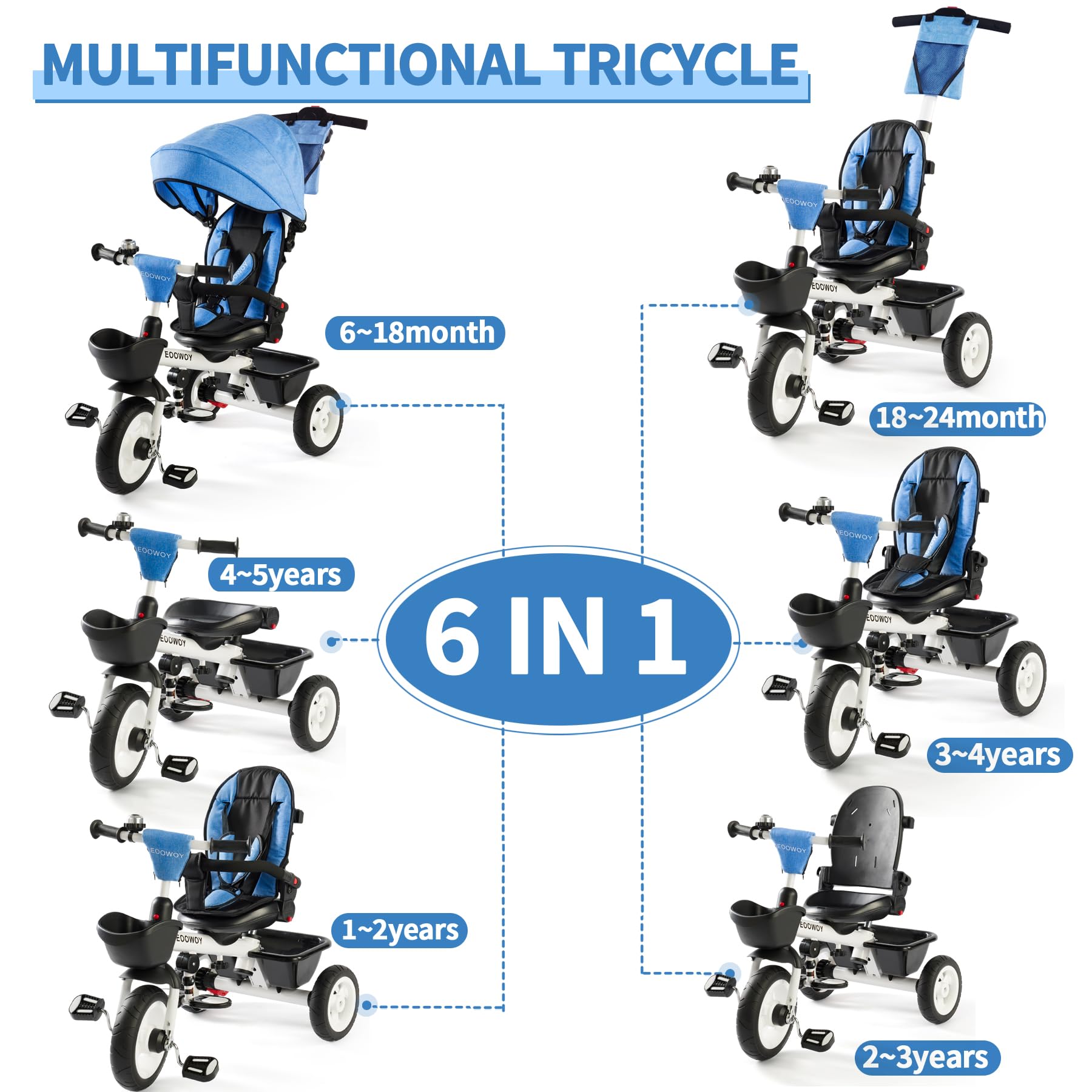 EOOWOY Baby Trike, 6-in-1 Kids Tricycle with Adjustable Push Handle, Removable Canopy, Safety Harness for 18 Months - 5 Year Old