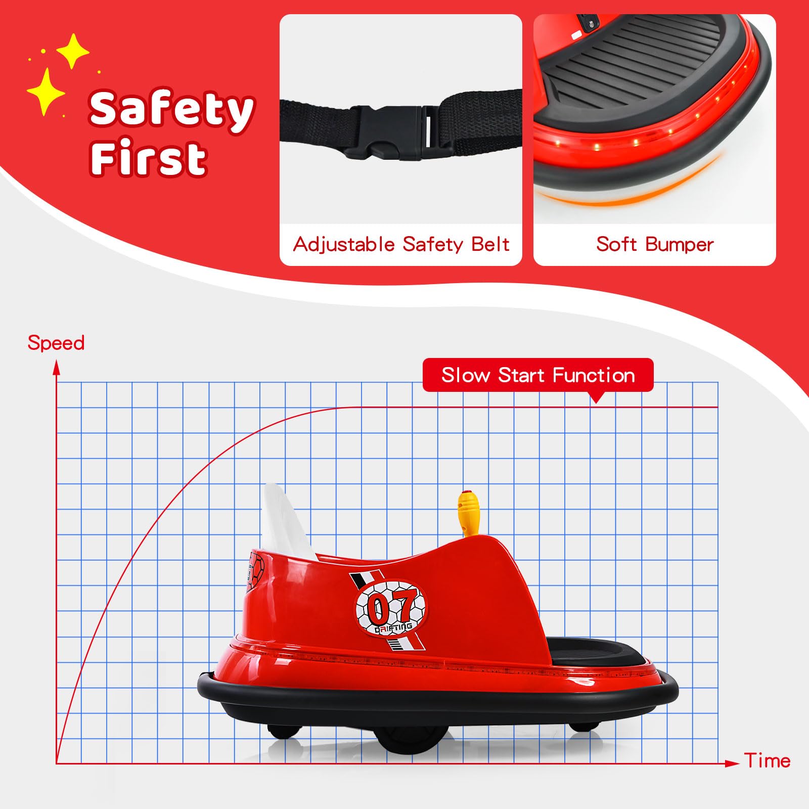 - Q: What safety features does this bumper car include? A: The HONEY JOY bumper car is equipped with a soft bumper for protection, a slow start function for added safety, and an adjustable seat belt to keep your child secure while riding.