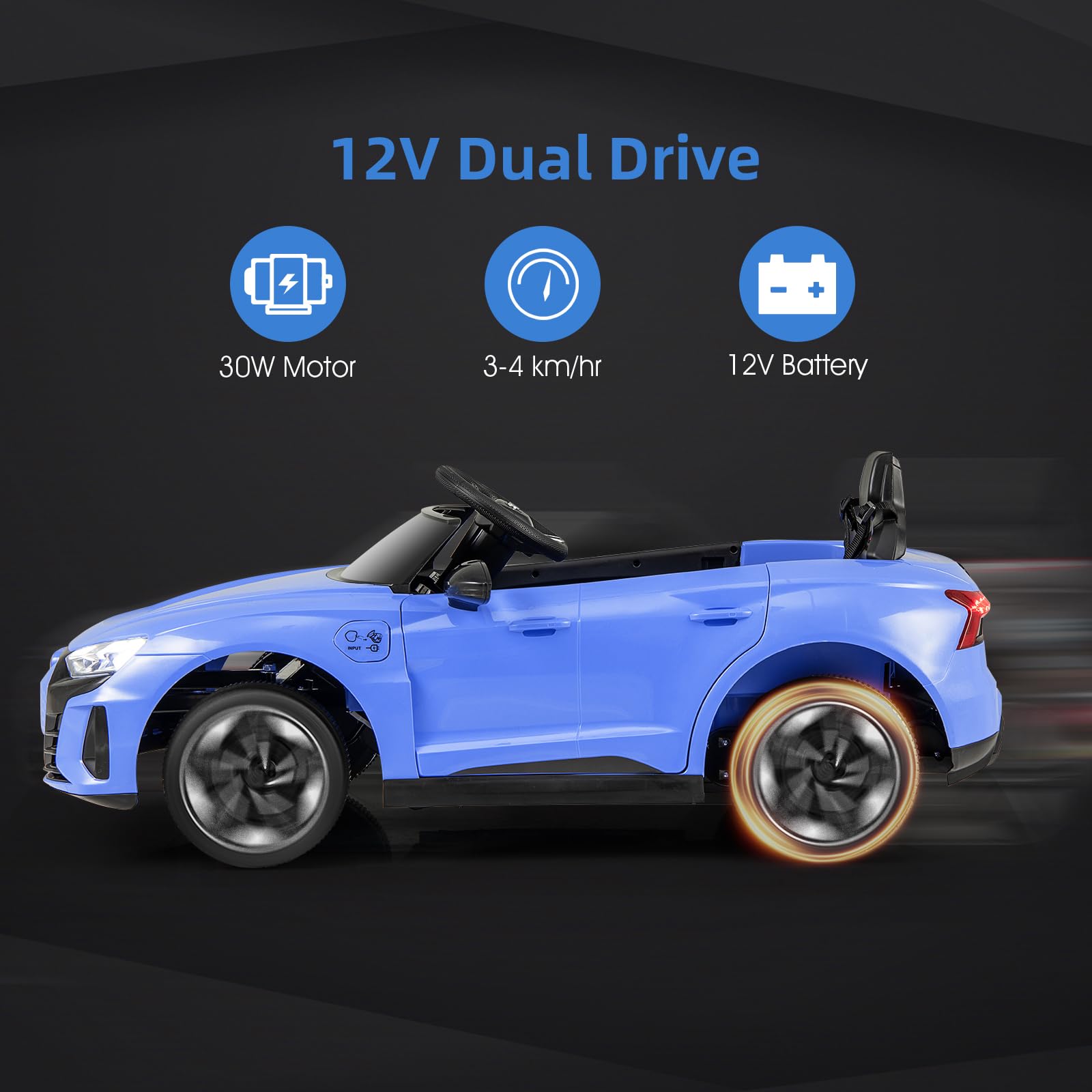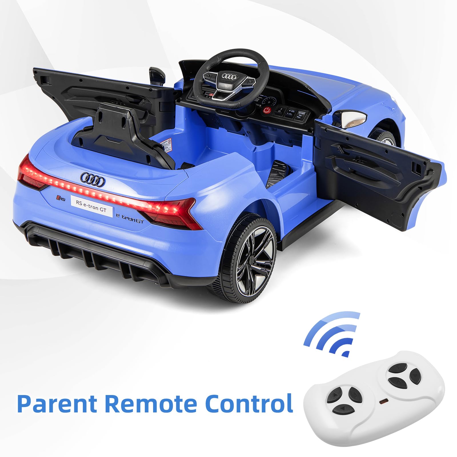 Licensed Audi RS e-tron GT: This licensed 12v ride on toys comes with realistic Audi design, which featuring with decor elements, bright LED headlights, a rotatable steering wheel and foot pedal. | 12V Powerful Driver: Powered by two 30W rear motors and 12V rechargeable battery, this ride on cars for toddlers is able to play for 40-50mins with fully charged and the max speed can up to 4 km/h. | Enjoyable Driving Experience: Kids can enjoy music and story on this audi car for kids through the USB, MP3 and TF card port. Built-in horn, forward/backward button also provide driving happiness. | Two Control Mode: This electric car for kids can be operated by children through the foot pedal and steering wheel. This kids car has a parental remote control by using the included 2.4GHz remote. NOTE: 2 x 1.5V AAA batteries required are not included. | Safety and Comfort Design: Four Wheels are equipped with spring suspension system, which ensure a smooth ride. The soft start function can also protect your children from accidentally started. | Durable and Quality Material: The ride on sports car with remote control is made from PP and iron material, and comes with 4 wear-resistant plastic wheels, which is lightweight and sturdy. It is suitable for kids from 37 to 95 months and bears up to 66 lbs. | DOE & CEC Certification Approved: Comply with the Department of Energy and California Energy Commissions electrical energy efficiency regulations to improve the efficiency of electricity products, save energy, reduce gas emissions, and greenhouse effects. | Compliant with US. CPSIA and ASTM Requirements: Made of non-toxic materials without any odor, FREE from BPA, PVC, Phthalates, Lead, Latex, and Formaldehyde. No sharp points or edges. Passed the tests of stability, asphyxiation,load, and shear.