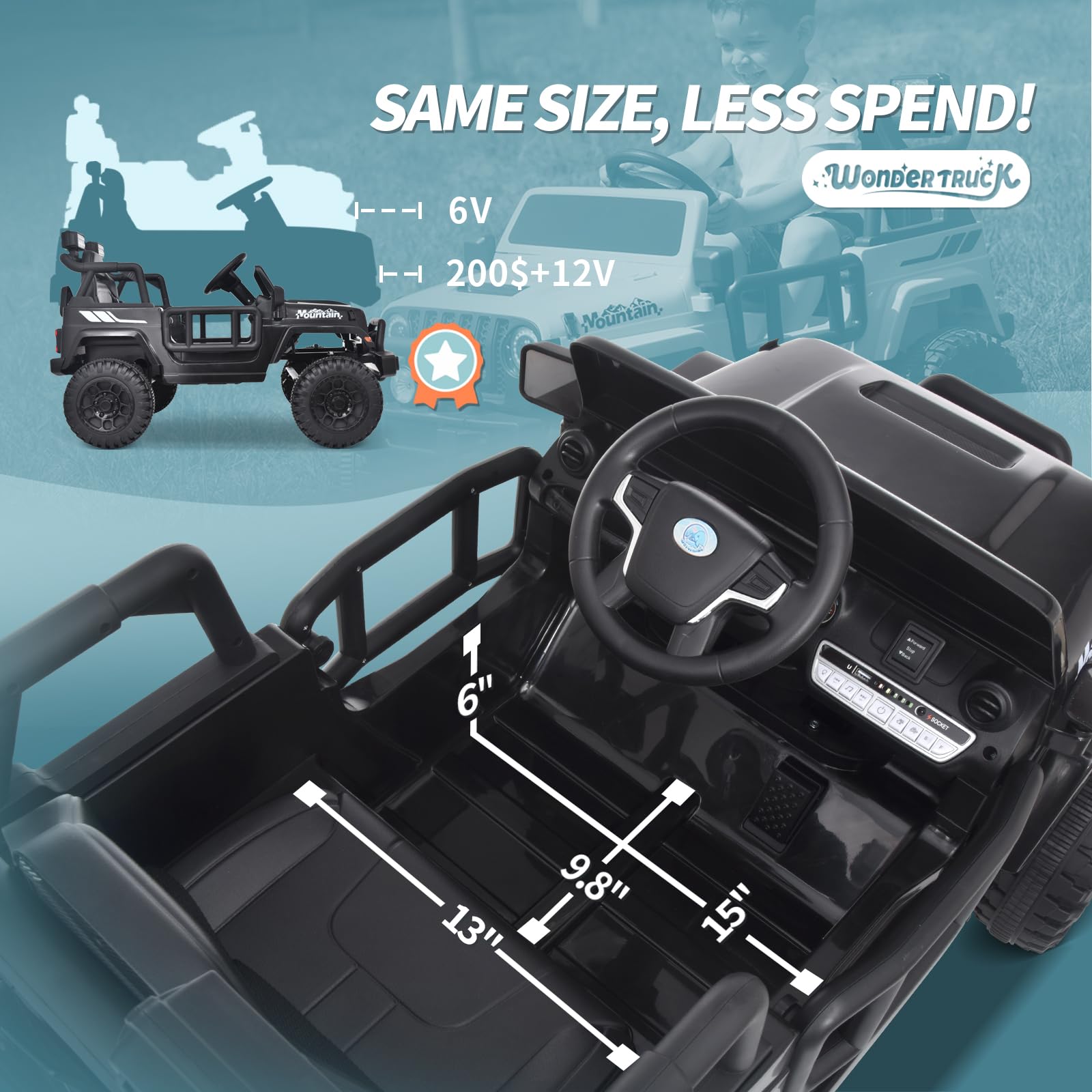 Joywhale kids ride-on truck equipped with 12V dual motors. Its powerful rear motors and wear-resistant wheels can support driving on a variety of terrain. 3 mph maximum speed for smooth rides on outdoor adventures. This 12V truck is designed by Joywhale specifically for kids under 6 years old. Weve made significant improvements to the product size, so you can spend less. Plus, this car offers ample space for a child to play without any restrictions! This wonder truck supports dual driving modes: parental remote control and kids manual operation. The kid ride on car is equipped with a slow start function to avoid the risk of sudden acceleration. Both front and rear wheels are equipped with spring suspension systems to ensure a smooth and comfortable ride. Ideal for outdoor playing. Adjustable seat belts and double-lockable doors ensure maximum safety for your little one. The electric truck comes with bright LED headlights and colourful tail lights, allowing kids to play even in the dark. The wireless music player, FM radio, and real car engine sound provide children with a real driving experience. Portable handle for easy move when battery runs out on the way.