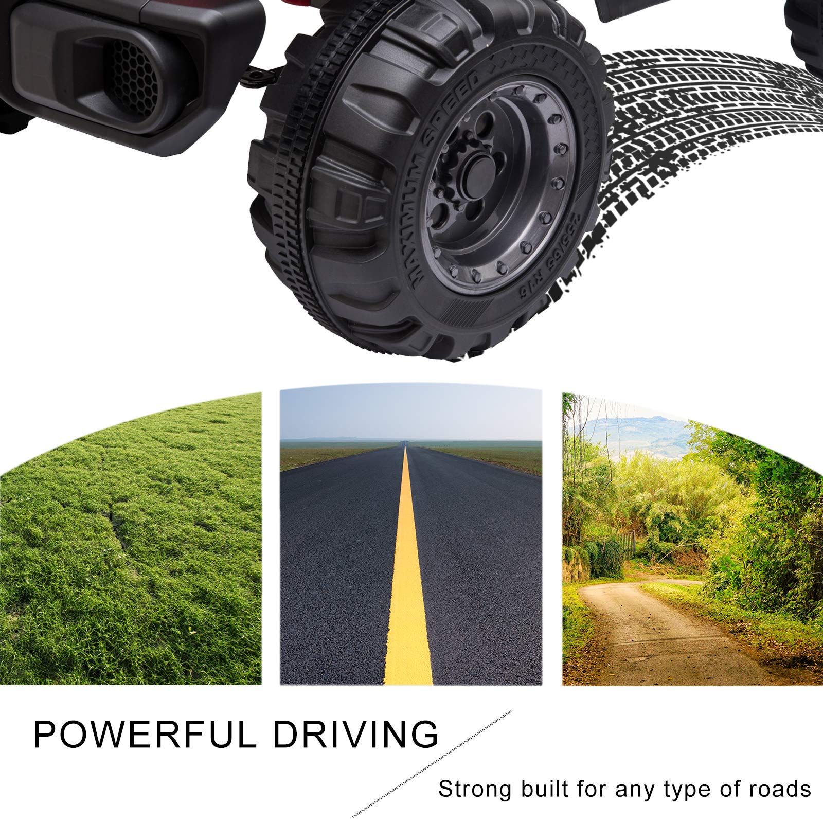 Great Safety: This kids electric car is made of a non-toxic, durable, non-chipping, and rust-proof material which is sturdy and durable. Equipped with 4 wear-resistant wheels suspension and the smooth start accelerates design, which allows comfortable and safe driving experience. | Two driving modes: 1. Battery operate mode: Children can proficiently operate the ride on cars by using the pedal and steering wheel. 2. Parental remote control mode: Parent can also control the kids car via the remote controller. Two modes design can improve the safety while driving. And parent and lovely children can enjoy the happiness together. | Realistic functions: Equipped with Bluetooth, AUX port, USB port, this ride on toys can be connected to your phone to play your favorite music. These interesting sounds will bring extra surprise and increase the pleasure for driving. | Suitable for any Road: The ride on truck features 4 wear-resistant wheels, which is made of superior PP material without leaking or tire burst. Powerful motor and tires not only makes sure a long-term driving experience, but also allow it to travel freely on different roads, whether on grass, wooden boards, rubber roads, muddy roads, or sloped dirt or sandstone roads. | Perfect Gift: This kids electric vehicles is a right gift for children in birthday, Christmas and other gift-giving occasions. It will accompany your kids and create cherished childhood memory. Size: Overall Dimensions: 43.31L*28.35W*28.35H,Seat Size: 13.7L*7.7W, Weight: 46.3LB , ,Maximum weight capacity is 66 lbs.