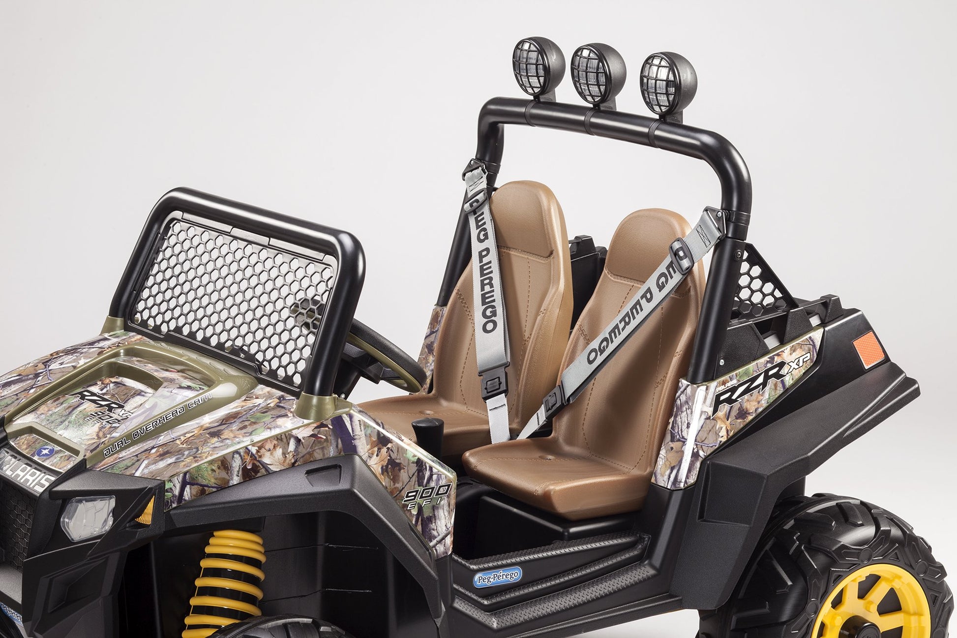 The new Polaris RZR TM 900 CAMO is the perfect riding vehicle for kids who like adventure! Theyll drive their own CAMO RZRTM, hauling their equipment in the large cargo bed with tie-downs. The accelerator provides smooth driving, automatic brakes and increased riding time. The 2-speed shifter with reverse allows them to drive at 21/2 or 5 mph on grass, dirt or hard surfaces. Parents appreciate the 5 mph speed lockout that prevents beginners from going too fast and the adjustable bucket seats that allows them to use it year after year. 12-volt rechargeable battery and recharger included. Made in USA.