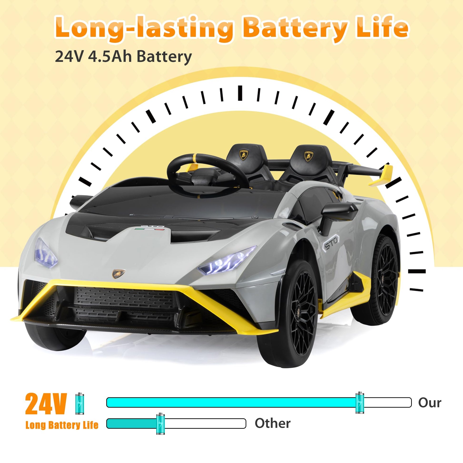 ???SPECIFICATIONS?Overall size: 46.06* 27.17* 16.93 INCH (L x W x H). Maximum Load: 88 LBS (40KG). Battery: 24V 4.5AH. Speed Range: 3.73-6.21 MPH (6-10 KM/H). Recommended ages: 3-8 years. | ???TWO DRIVING MODES? Kids can easily run this 24v ride on car by the start button, foot pedal and steering wheel for about 1 hour while the parent can override the toy car via the remote control for maximum safety. | ???POWERFUL & EXCITEMENT?This electric car for kids comes with dual upgraded 24V motors, which when put in drift mode can produce speeds up to 10 mph. The wide single 2-seater makes sure your toddler is comfortable when driving. | ???BEST GIFT FOR KIDS?Made of premium PP and iron, this battery-powered motorized lamborghini is sturdy and durable, which is a popular gift for kids aged 3-8 years to cultivate motor skills and drifting ability; 4 wear-proof wheels and an adjustable safety belt ensure stable and safe driving outdoors. | ???ENJOY SPEED AND EXCITEMENT?This TOBBI Official Licensed 24V Lamborghini STO Kids Car is built for your little adventurer to enjoy exciting drifting at an early age. Turn the start button, step on the foot pedal, and grip the steering wheel. Kids can easily take a sharp turn to enjoy drifting fun.