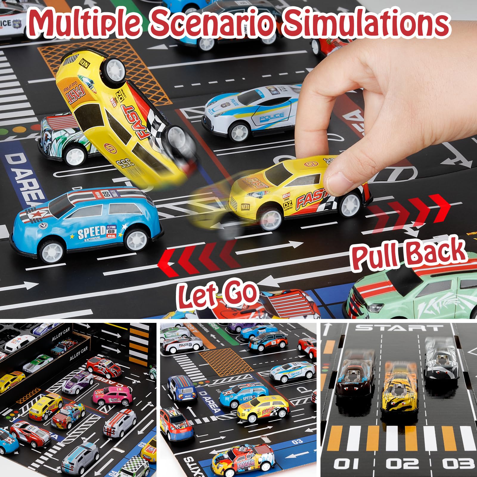 48pcs Pull Back Cars Set,Alloy Racing Car Toys,Bulk Mental Trucks Toy Vehicles Set,Goodie Bag Stuffers Mini Cars Party Favors for Kids Boys and Girls The bodies of 48pcs pull back cars are made of metal, the bottom of the body is made of high-quality ABS plastic, which has passed American safety standards.The mini cars are safe and reliable, bright and colorful.Race cars toy has smooth and rounded edges,there are no sharp edges or corners that can hurt your child. Rubber wheels allow the toy cars to run more further and faster.The toy cars for kids set includes 48pcs all kinds of pull back cars ,with splendid color and different shapes.The whole cars package looks like a container,4 level draw designs. The packaging box can be unfolded into a map,can simulate various different scenarios for kids. Perfect for party favors, Easter egg fillers, cake decorations, Christmas gifts, or as a fun addition to any toy collection for boys age 4-7. The children's car is about 2.4 inches long, which is very suitable for 3-12 year old children to easily grasp and operate, and can also be easily placed in a bag or pocket to play outside. It can stimulate children's curiosity and imagination, help develop fine motor skills and hand eye coordination abilities.