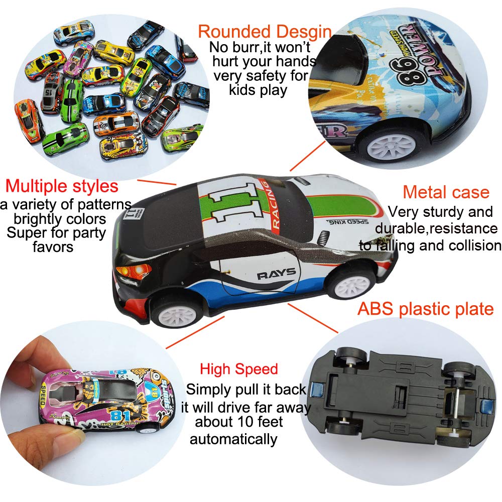 MAIN FEATURES pull it back and automatic go,friction powered,no battery need, ,very easy to play. high quality ,the shell is made of metal,and the bottom plate is made of ABS plastic, no toxic,durable. adopt rounded conner desgine,which won't hurt hands,very safety for kids play. PACKAGE LIST 18pcs pull back racing cars