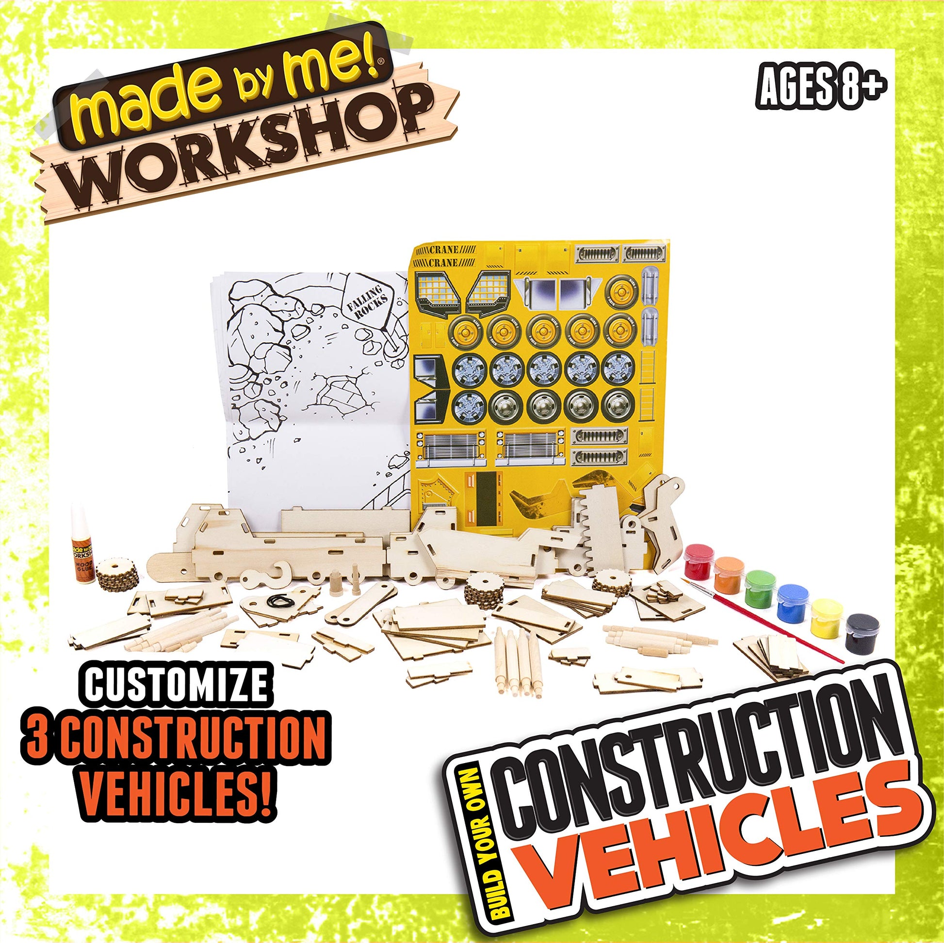 Build, design and play with the Made By Me Workshop construction vehicles that feature a bulldozer, dump truck, and crane Customize your vehicles with bright colored paint, shimmery glitter, and stickers to make your toys stand out. Once dry, take your vehicles to your very own construction zone included on the construction scene paper play mat. This hands-on activity is great for encouraging creativity, self-expression and imaginative play. Recommended for ages 8 and up.
