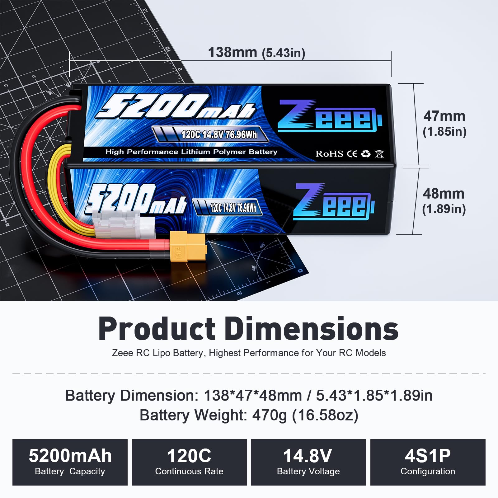 Features Zeee RC LiPo batteries are light weight and provide high energy storage to weight ratios, are capable of safe fast discharges, have quick recharge times,and no memory-effect Specification Brand: Zeee Model No.: Zeee Lipo 5200mAh Battery Capacity: 5200mAh Voltage(V): 14.8V Discharge Rate (C): 120C Configuration: 4S1P Plug: XT60 Connector Battery Dimensions(L*W*H): 138*47*48mm/5.43*1.85*1.89inch Approx Weight(15g): 470g/16.58ozCompatible RC Models - Zeee 4S 5200mAh Lipo Battery compatible with professional 1/10 scale and 1/8 scale RC car hobby models, Emaxx, Bandit, Rustler version, Losi, Team Associated, etc. Package Including 2 Pack of Zeee 14.8V 120C 5200mAh Lipo Battery with XT60 plug Attention - Lipo batteries are potentially hazardous. Improper usage can cause fire or explosion. - For the RC battery, only if the voltage and the plug match, then it will fit. - Please stop charging immediately when the cell voltage been charged to 4.2v (Normal cell voltage is between 3.2v~4.2v). - If the new battery wont hold a full charge or loss the charge very quickly in short time, please use Balance Charger to charge and recycle several times first.