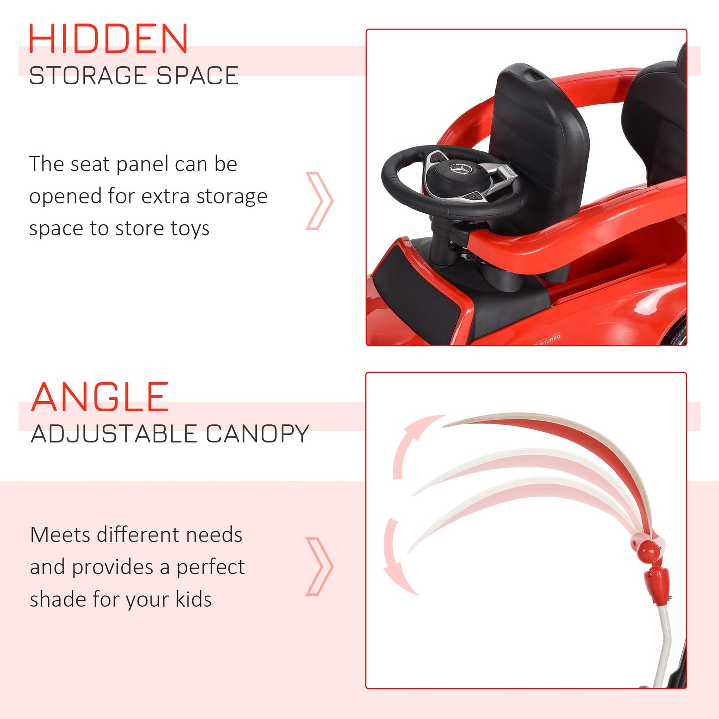 MERCEDES-AMG C63 Licensed: This push car features the style of the real MERCEDES and provides children with an exciting indoor and outdoor riding experience. Plus, the sun canopy offers plenty of protection. | Realistic Steering: The steering wheel you see? Its real, which means you child can have tons of fun controlling where they go next. The baby push car gives your child a fun and realistic experience, with a horn and music built right in! | Storage Space: There is a spacious storage area located right under the cars seat for easy transport of toys, books, etc. This push car for toddlers features a cup holder on the handlebar for the baby