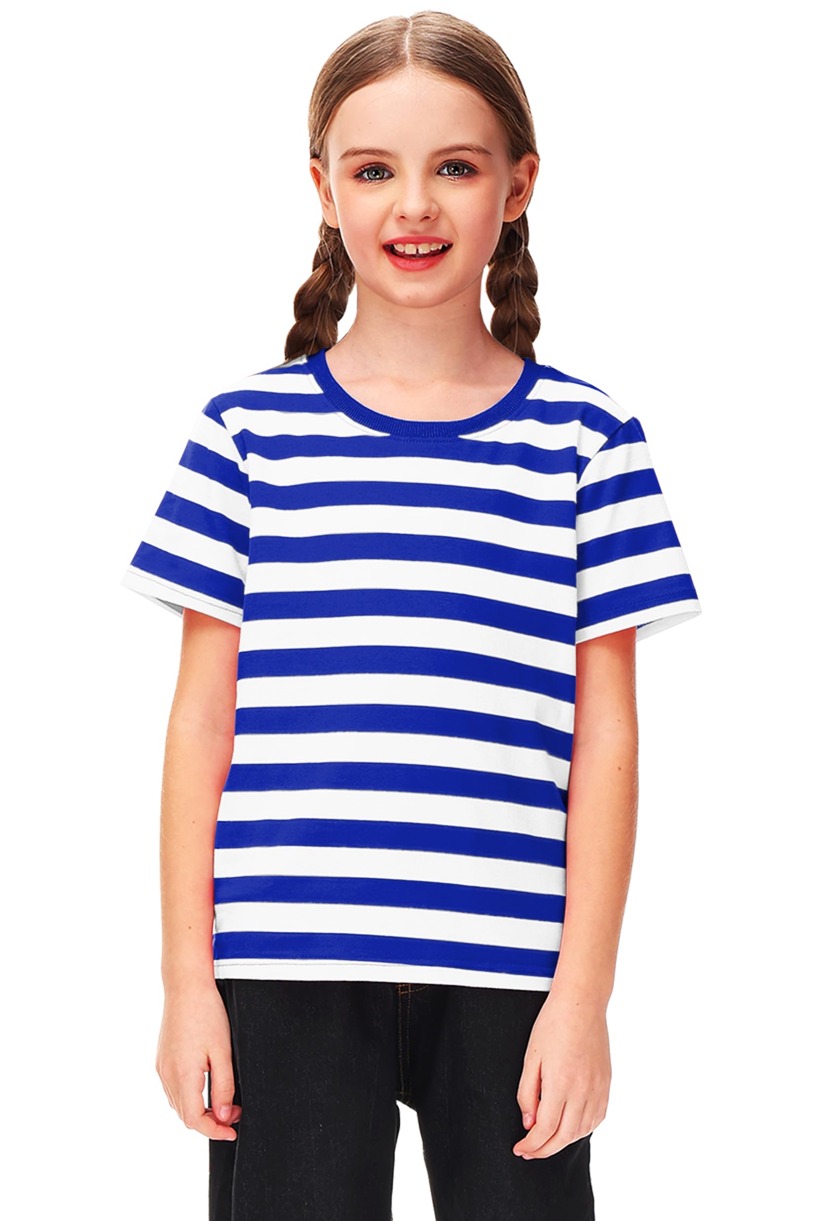 Boys Halloween Prisoner Costume Girl Blue White Striped Shirt Short Sleeve Summer Basic Tee Top 5-6 Years