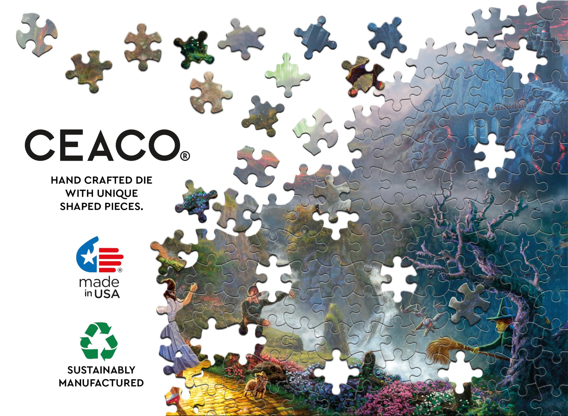 - Q: What makes the Ceaco Thomas Kinkade jigsaw puzzle unique? A: The Ceaco Thomas Kinkade jigsaw puzzle features handcrafted die-cut pieces with unique shapes, enhancing the puzzling experience. It showcases vibrant imagery that captures the magic of 'The Wizard of Oz', making it a beautiful art piece as well as a challenging puzzle.