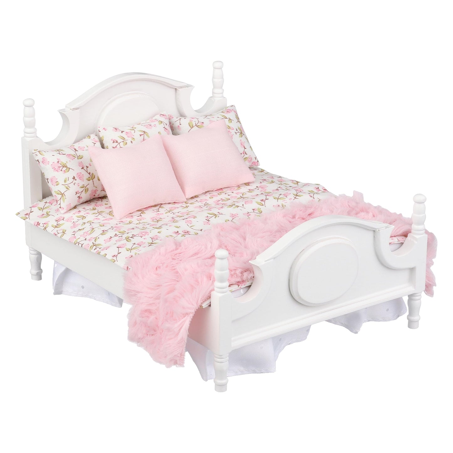 View compareDollhouse Furniture Mini Bed Set, Realistic Bedroom Accessories For 6 Inch Dolls, Pillow, Wooden Frame, 1/12 Scale (White Bed, Pink Bedding)