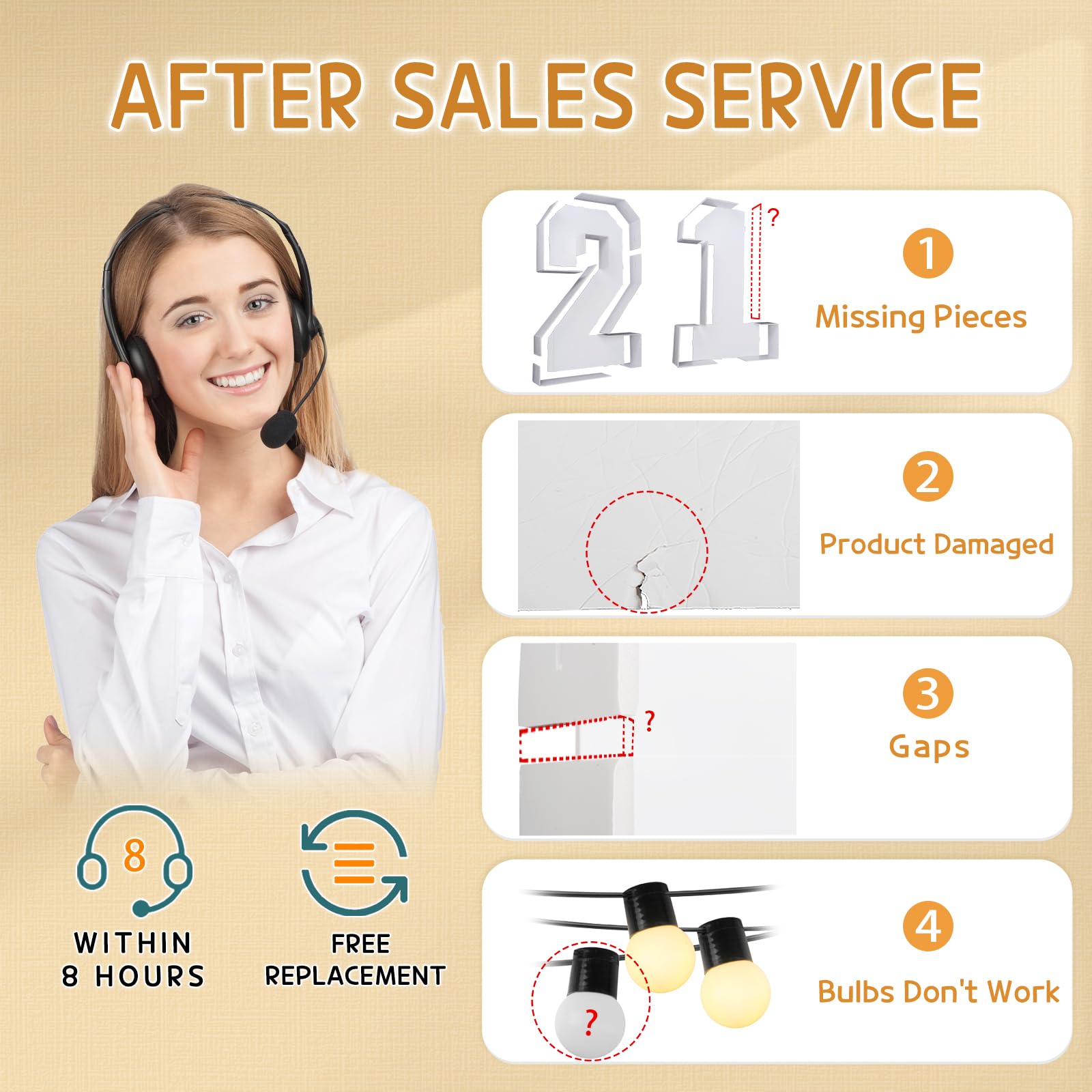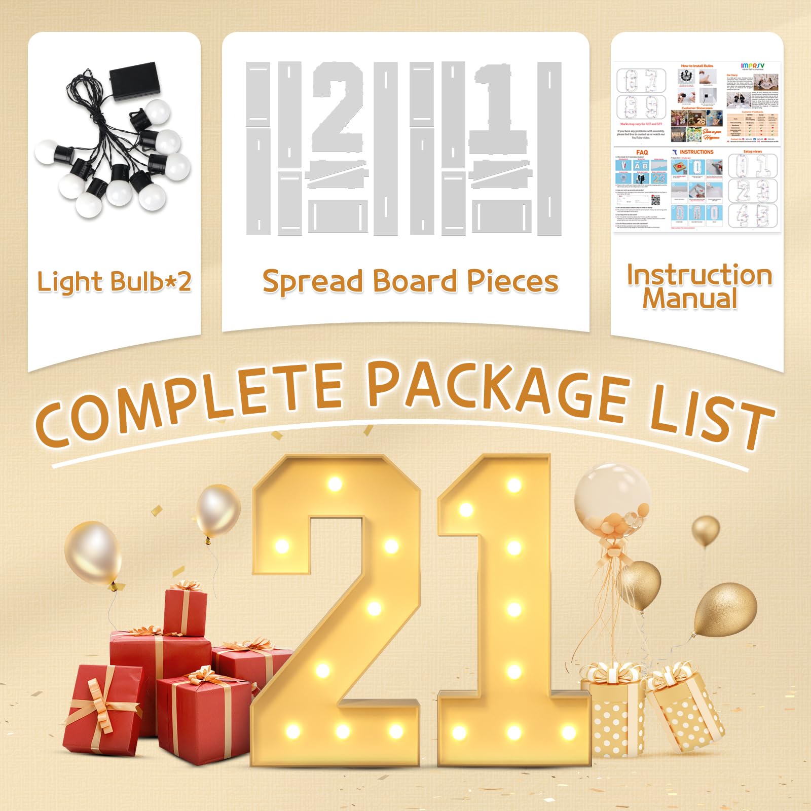 • Q: What is included in the package for the birthday decorations? A: The package includes a set of birthday numbers '21', white pre-cut number frames, two light bulb strings, and assembly instructions, making it a fun project to enjoy with friends or family.