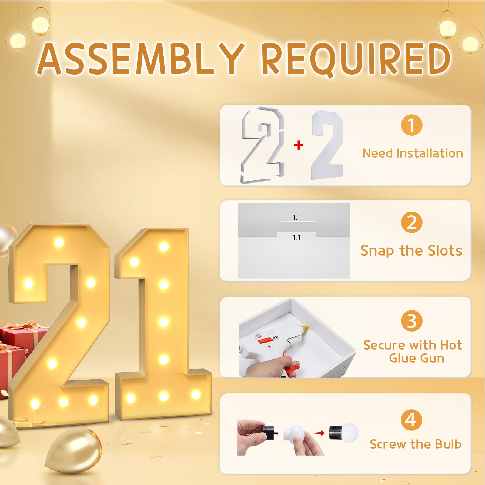 • Q: How tall are the light-up numbers for the 21st birthday? A: These light-up numbers stand 3 feet tall, equivalent to 36 inches or 90 cm, making them an eye-catching centerpiece for your birthday or anniversary party.