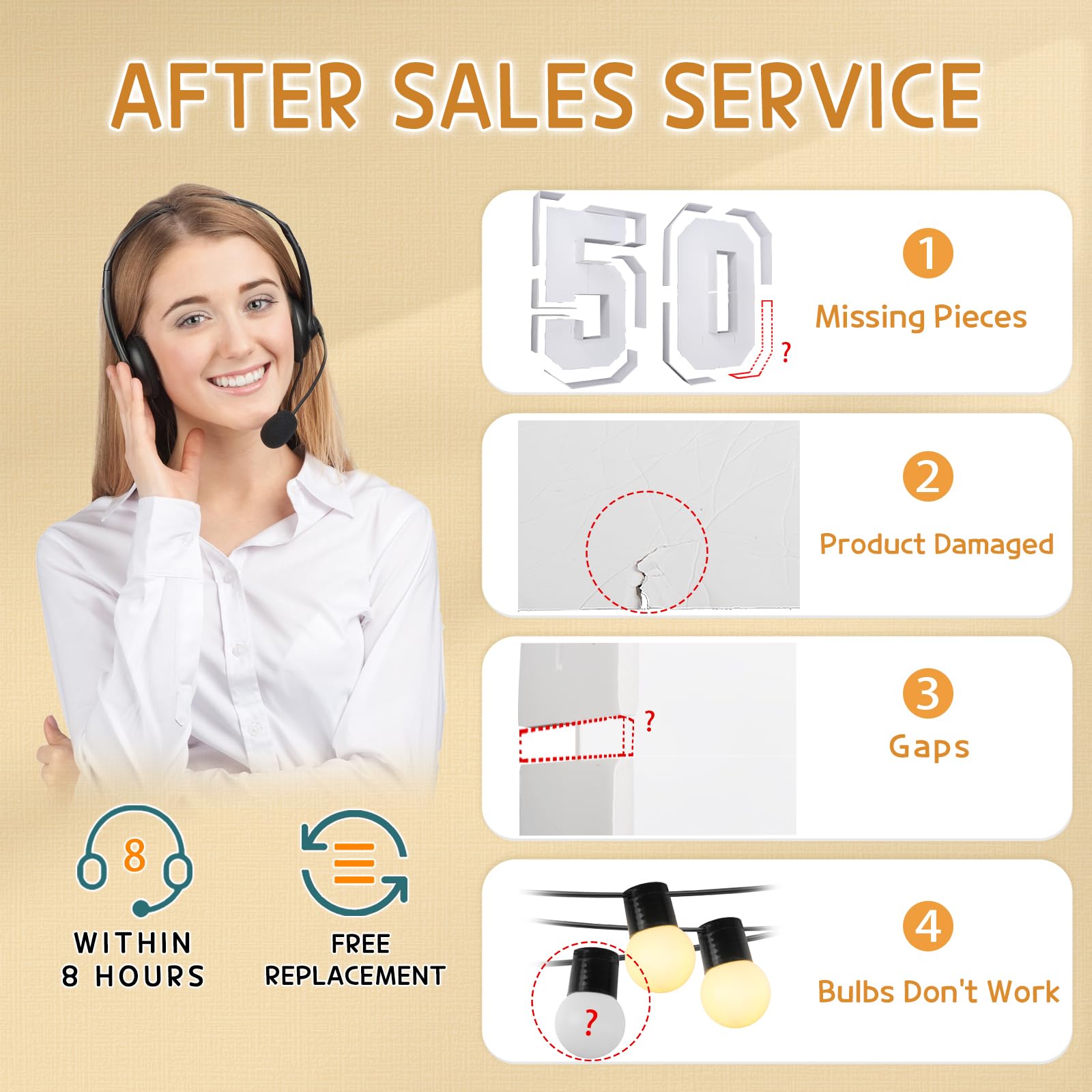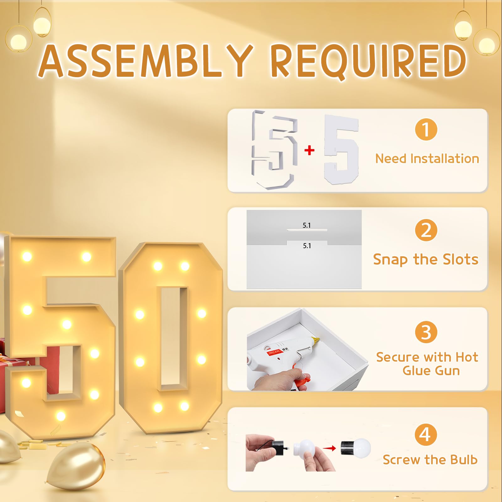 - Q: What is included in the package for the birthday decorations? A: The package includes a set of the number 50, white pre-cut frames, two light bulb strings, and assembly instructions for your convenience.
