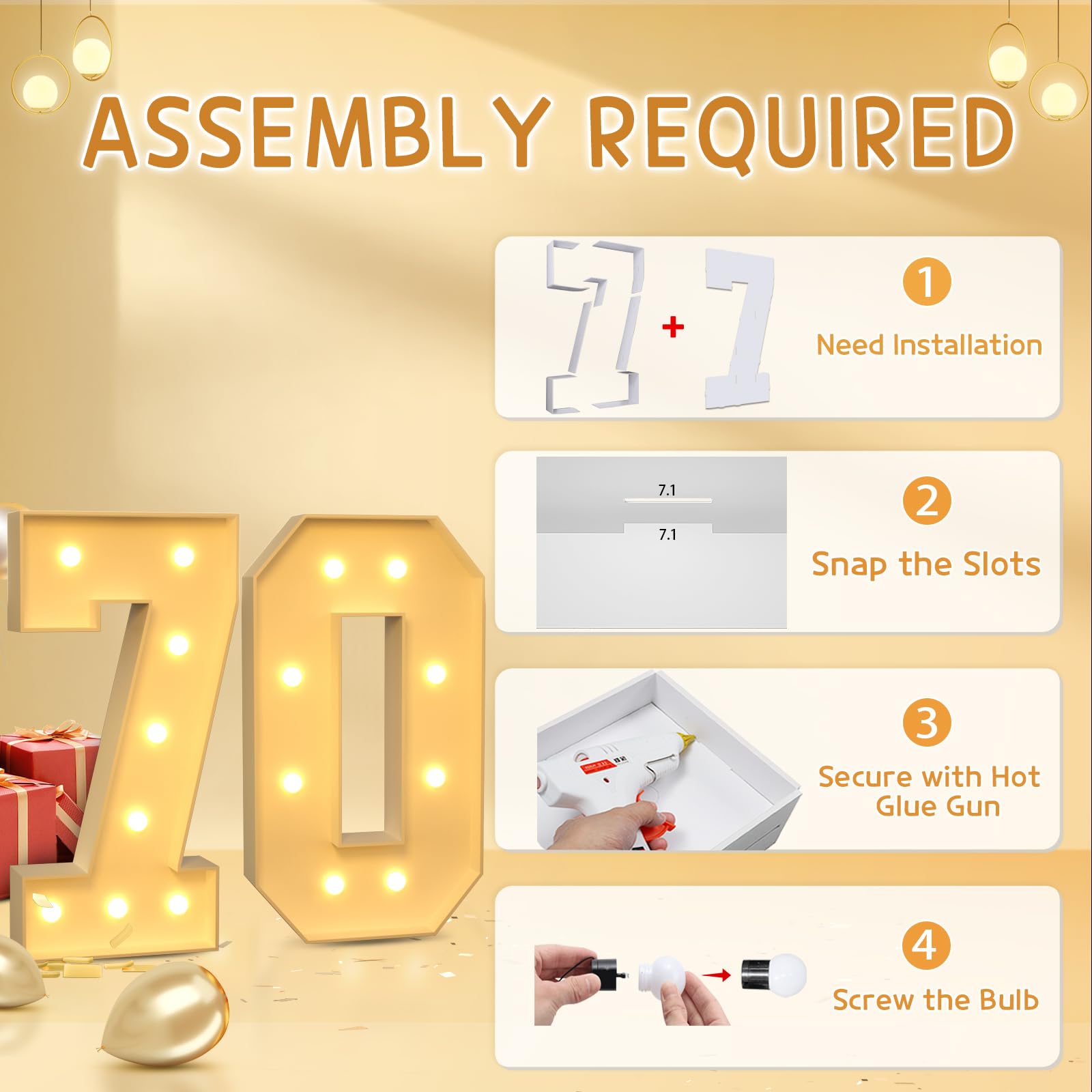 - Q: Is assembly required for the birthday number decorations? A: Yes, assembly is required. Each number consists of a pre-cut frame with slots. You will need to match the slots on the board and secure them with a hot glue gun, followed by attaching the bulbs to the frames.
