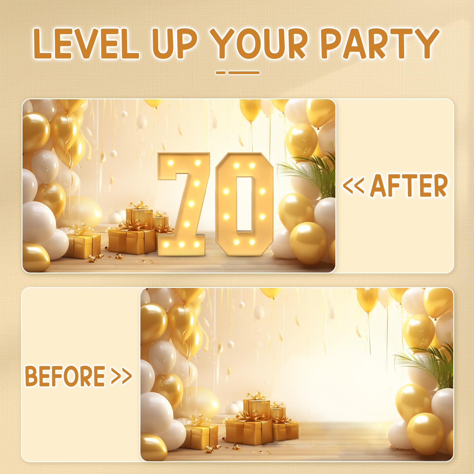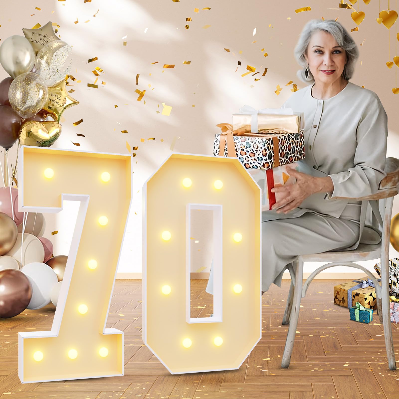 - Q: How tall are the light-up numbers for the 70th birthday party? A: The light-up numbers are 3 feet tall (36 inches or 90 cm), making them a striking focal point for your birthday or anniversary celebration.