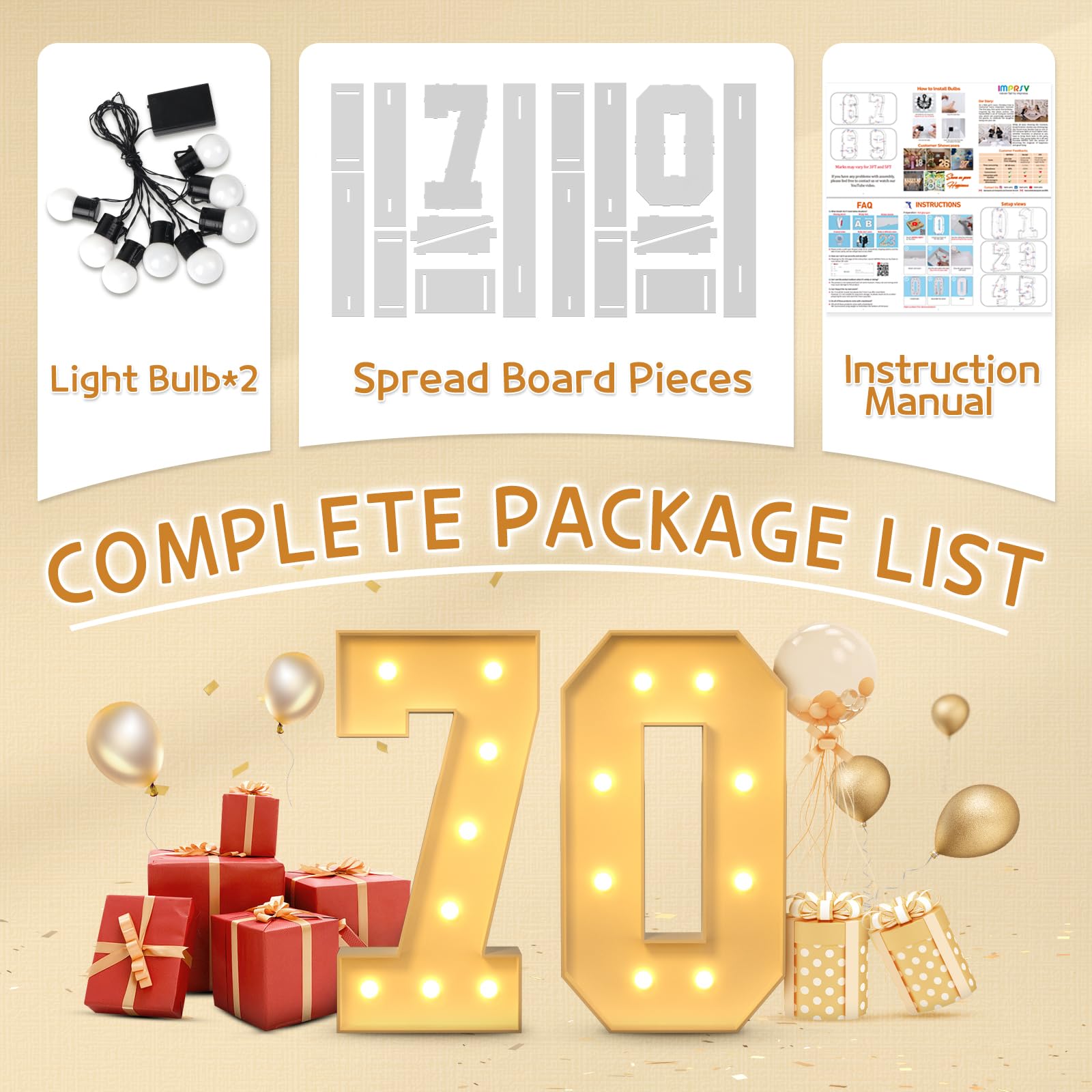 - Q: What is included in the package of the 70th birthday decorations? A: The package includes a set of birthday numbers 70, which comes with white pre-cut number frames, two light bulb strings, and assembly instructions for easy setup.