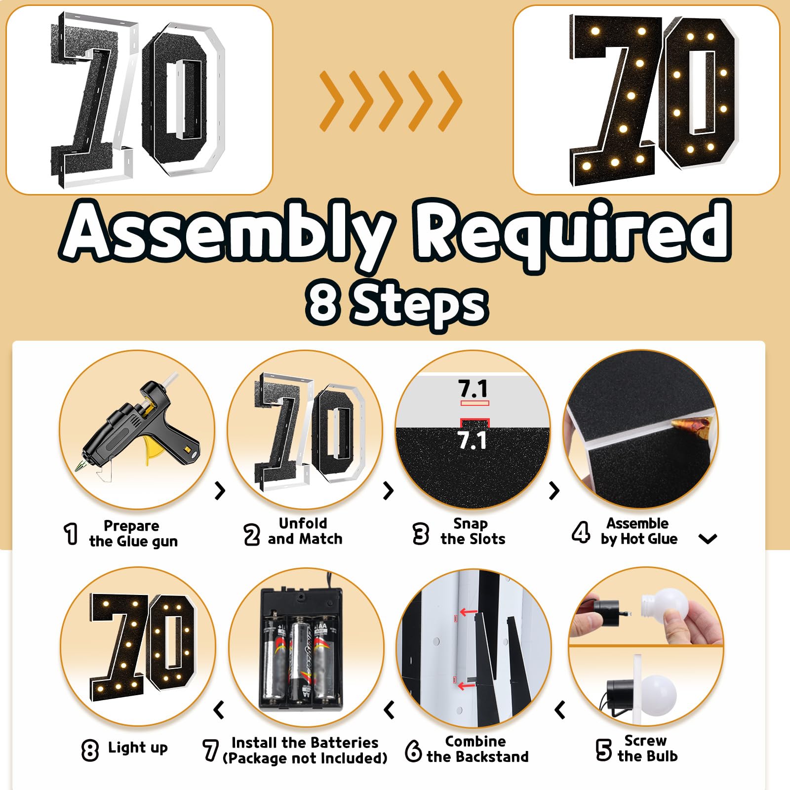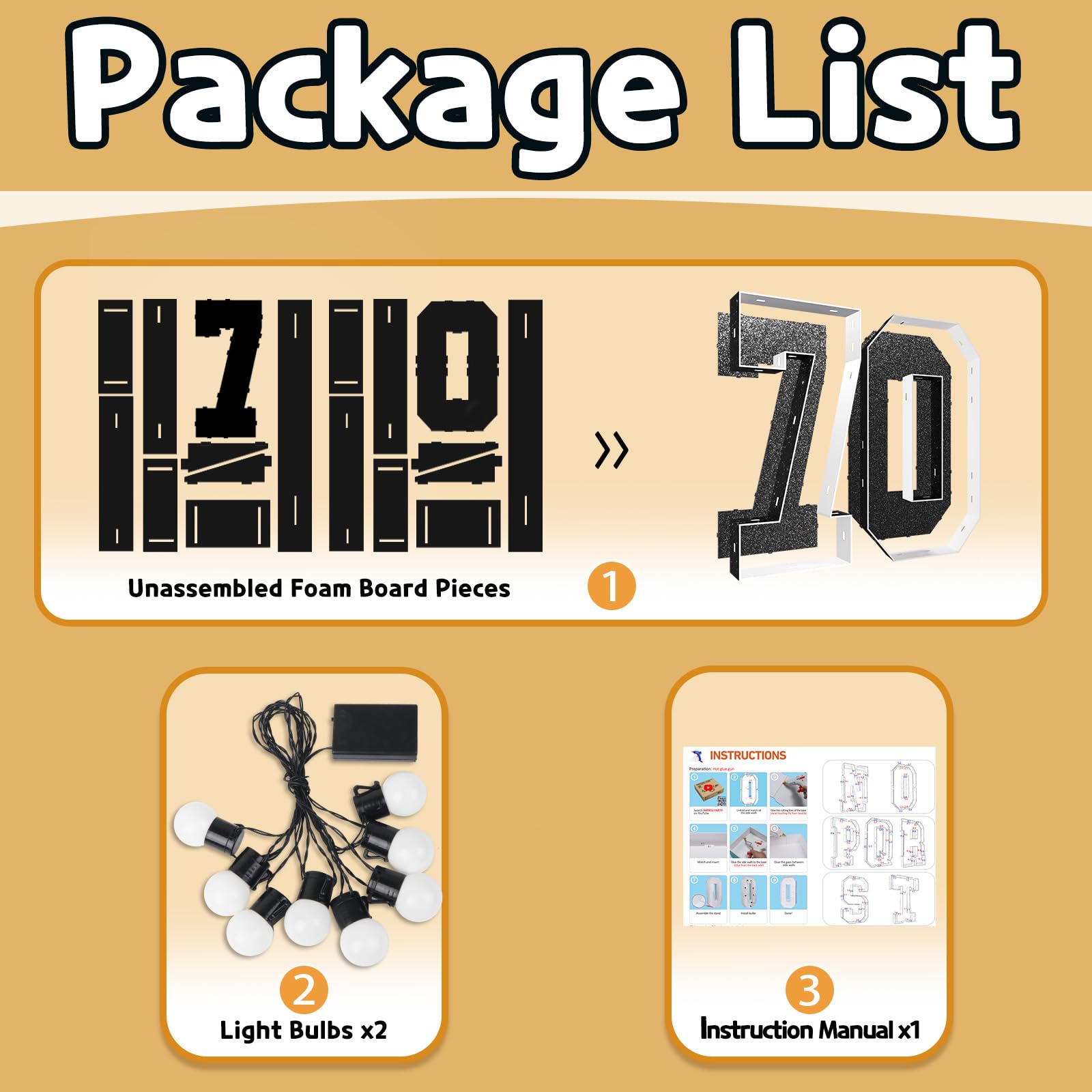 - Q: What is included in the package for the 70th birthday decorations? A: The package includes a set of birthday numbers '70', featuring white pre-cut frames, two light bulb strings for illumination, and assembly instructions to guide you through the setup process.