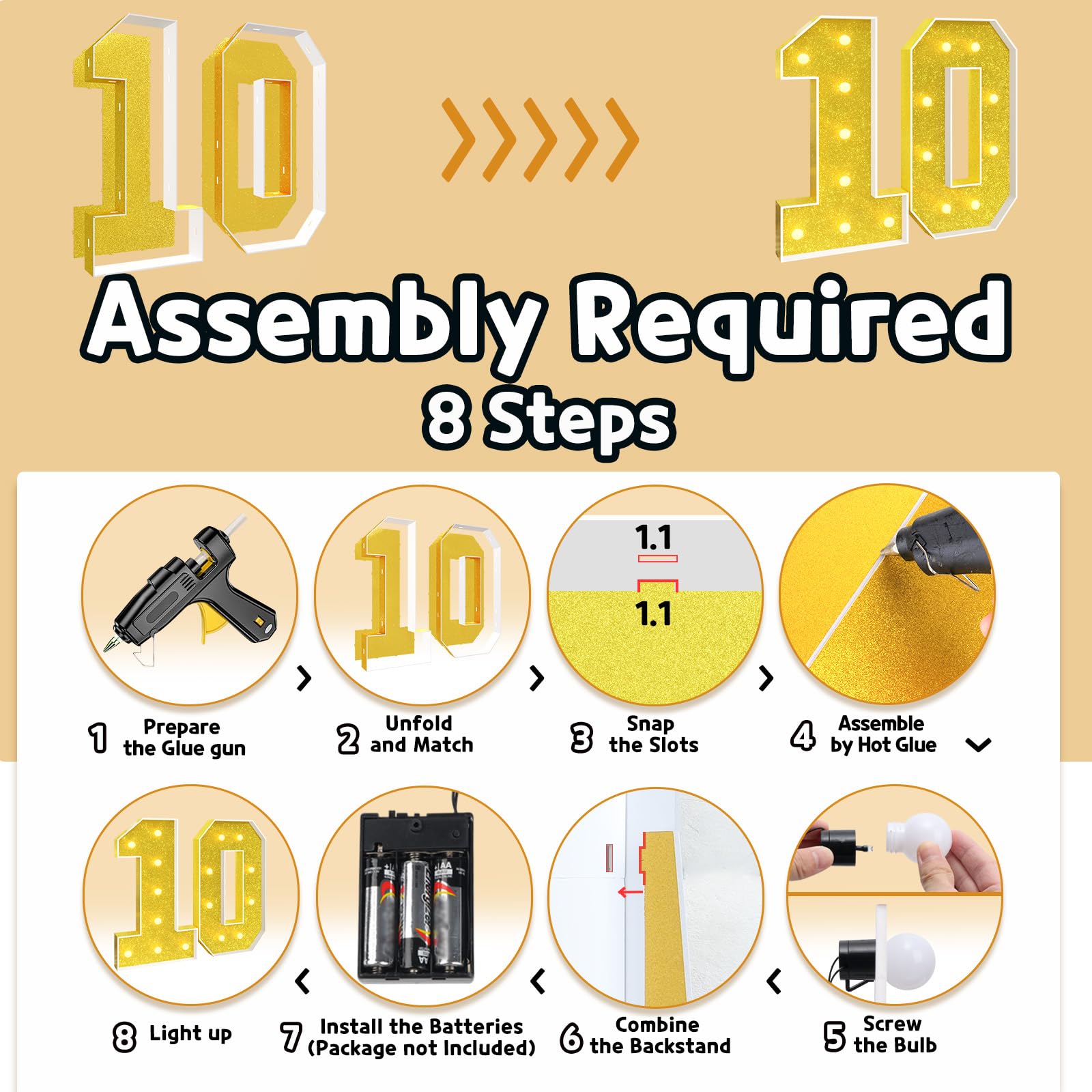 - Q: Is assembly required for the birthday numbers, and how is it done? A: Yes, assembly is required. Each number comes with a pre-cut frame and slots. Simply match the slots on the board with the frame, secure them with a hot glue gun, and then attach the light bulbs by screwing them onto the frames.
