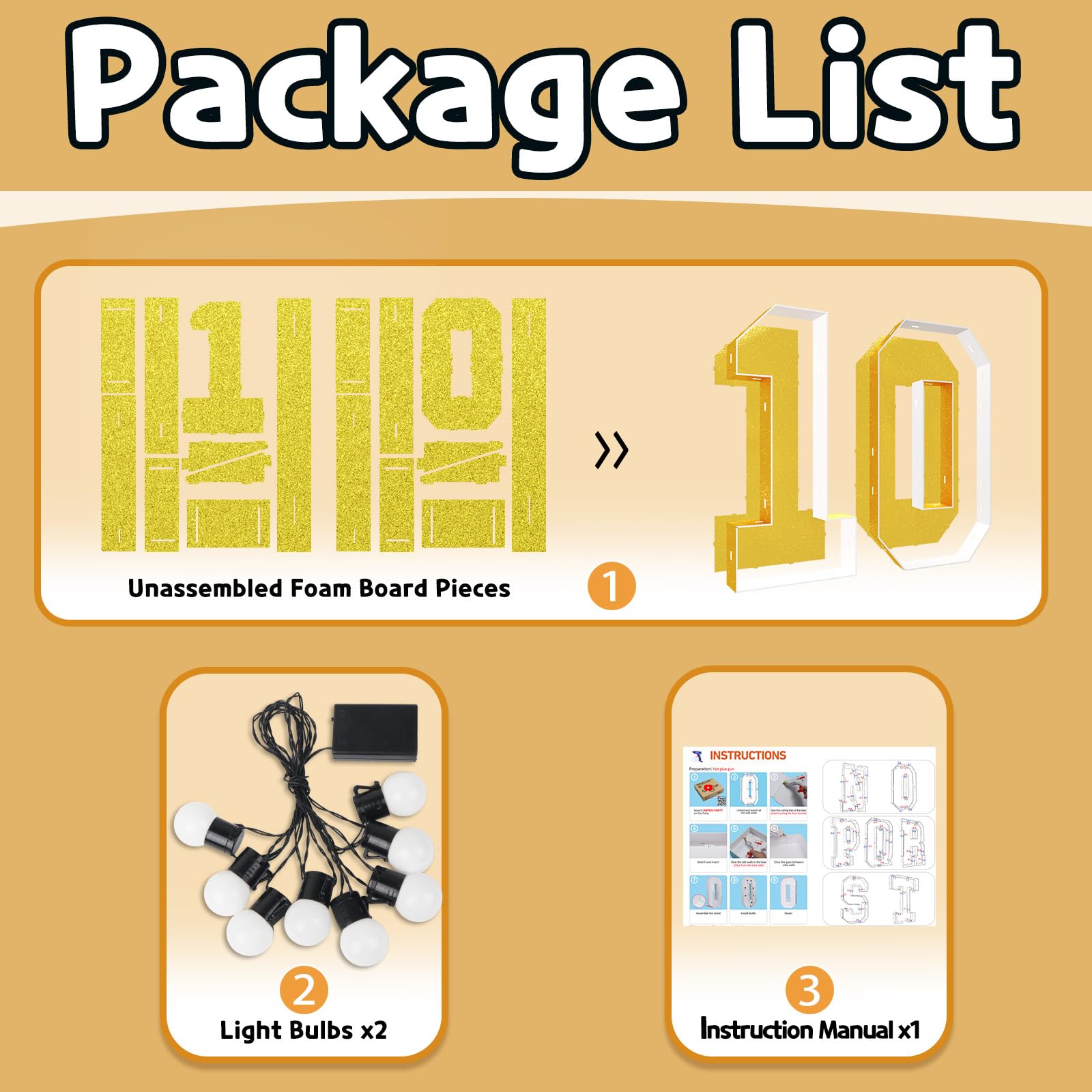 - Q: What is included in the package for the birthday decorations? A: The package includes a set of birthday numbers '10', consisting of white pre-cut number frames, two light bulb strings, and clear assembly instructions for a fun family craft project.