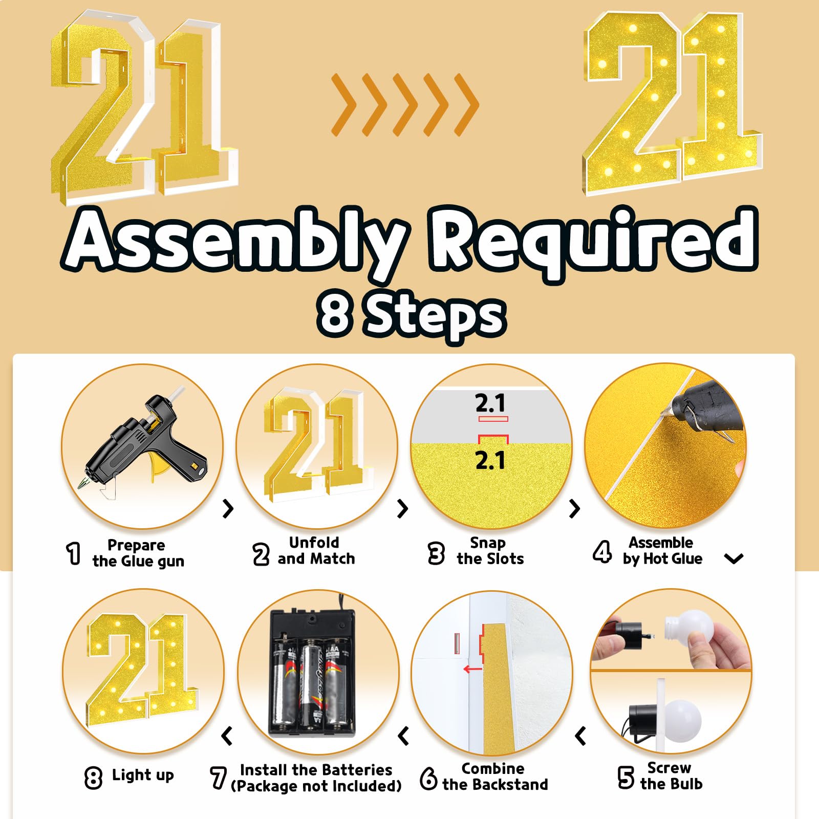 - Q: Is assembly required for the birthday decorations? A: Yes, assembly is required. Each number consists of pre-cut frames that need to be matched and secured using a hot glue gun, and the bulbs are attached by screwing them onto the frames.