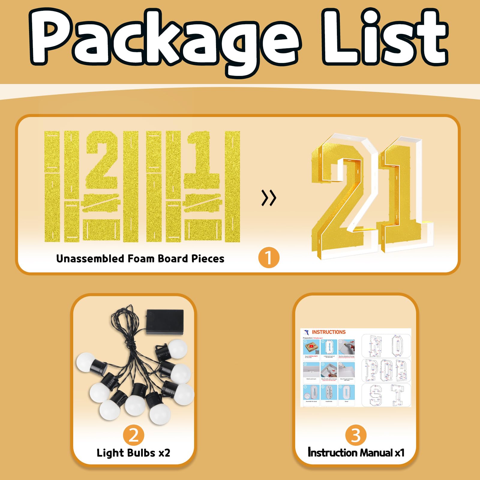 - Q: What is included in the package for the birthday decorations? A: The package includes a set of birthday numbers 21, which consists of white pre-cut number frames, two light bulb strings, and assembly instructions.