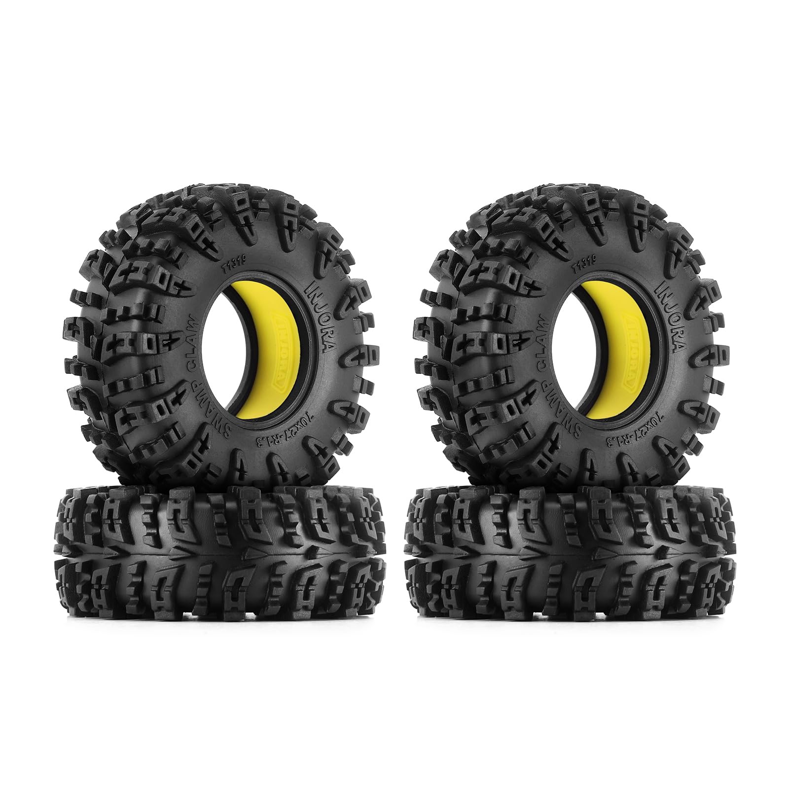 Tire Insert Specifications: Material: Silicone Rubber Size: 60*21mm (2.36*0.83in) Weight: 17g/pcs Yellow Inserts: Super Soft Tire Specifications: Part Number: T1319 Compound: INJORA S5 (Super Soft & Sticky) Material: Rubber Outer Diameter: 70mm (2.76in) Width: 27mm (1.06in) Each Tire Weight: 19g (0.67oz) Package List: 4 * Silicone Rubber Inserts 4 * INJORA 1.3'' Swamp Claw Tires