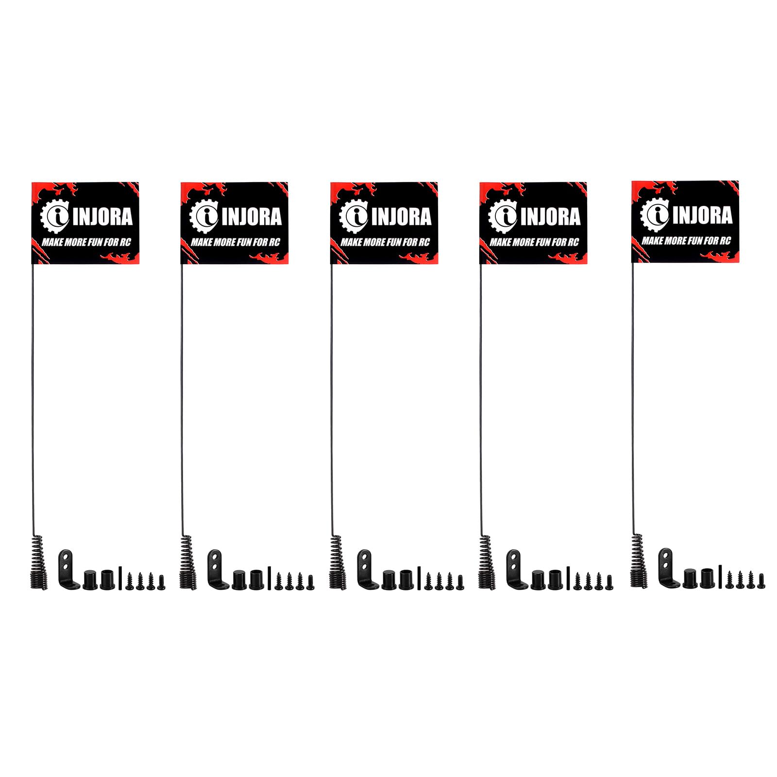 - Q: How many antennas and flags are included in the package? A: The package includes five metal antennas and ten INJORA flags, providing ample options for customization and decoration of your RC vehicle.