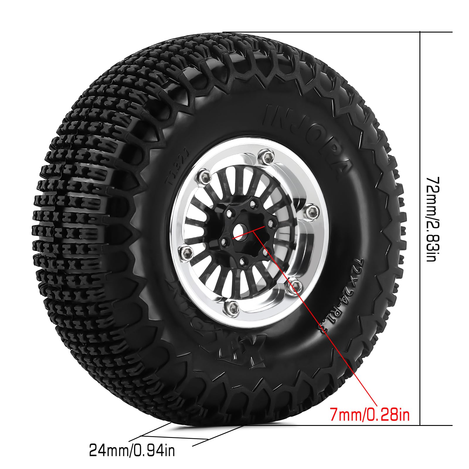 Wheels Specifications: Part Number: MW1306 Material: Carbon Fiber & Aluminum Color: Rainbow, Sliver Negative offset: -4.05mm Outer Diameter: 33.5mm (1.32in) Width: 16.5mm (0.65in) Wheel Hub: 7mm (0.28in) Each Weight: 21g/pcs (0.046lb) Tires Specifications: Part Number: T1321 Tire Compound: S5 (Super Soft & Sticky) Outer Diameter: 72mm (2.83in) Width: 24mm (0.94in) Each Tire Weight: 17g (0.59oz) Package List: 4 * INJORA 1.3'' Wheel 4* INJORA XHX Pin Tires