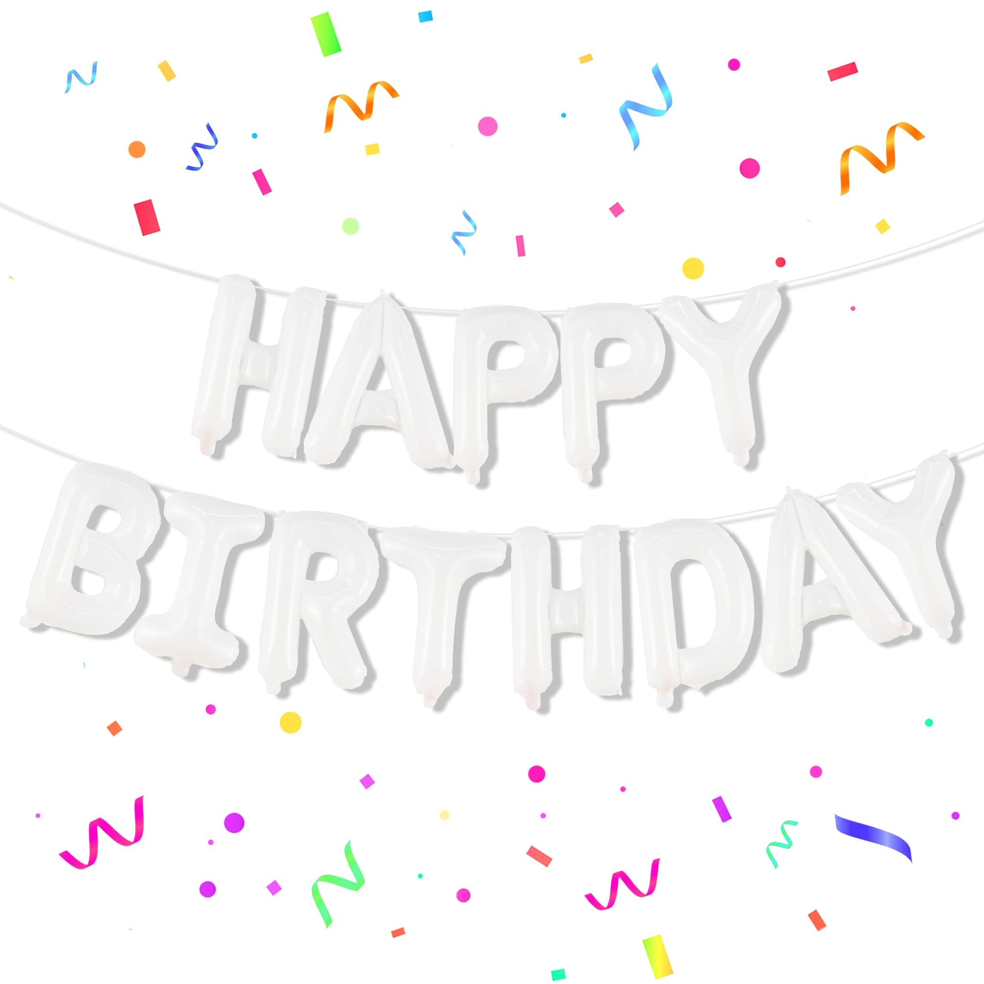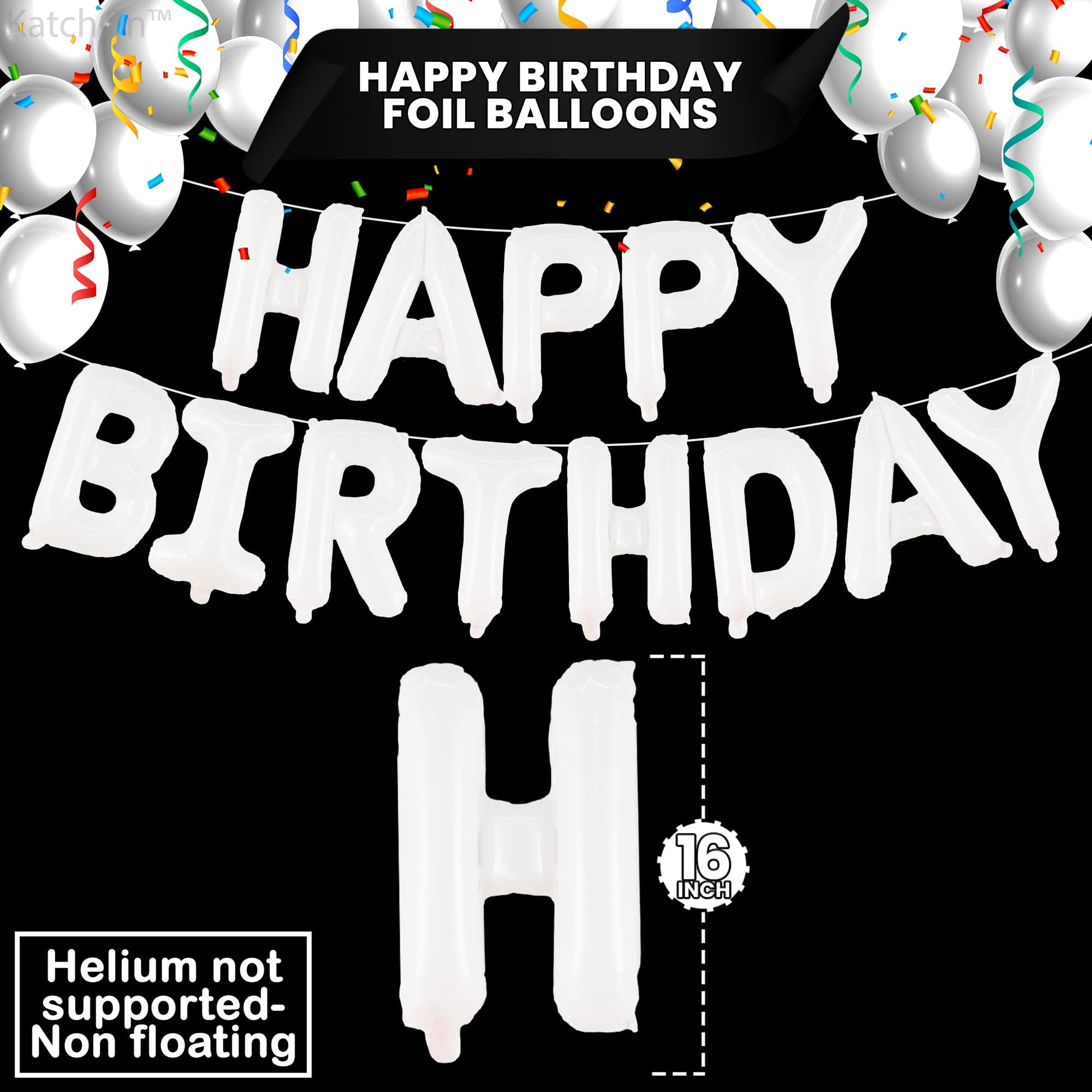 - Q: What is included in the KatchOn White Happy Birthday Balloons kit? A: The KatchOn White Happy Birthday Balloons kit includes 13 pieces of 16-inch foil letter balloons, 2 strings for hanging, a 32-foot balloon string, and a white straw for easy inflation.
