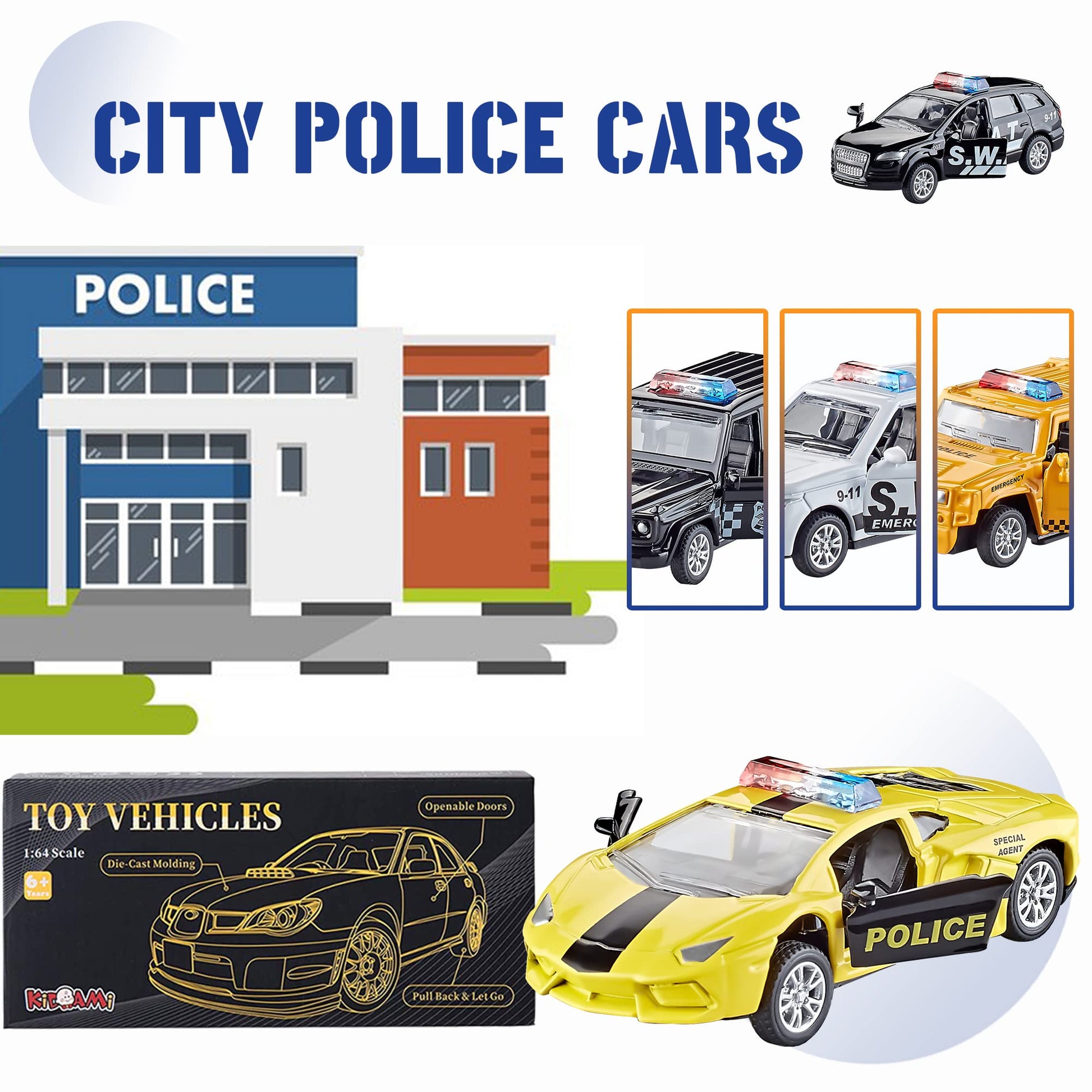 KIDAMI Die Cast Metal Little Toy Cars Set of 5, Openable Doors Pull Back Car Gift Pack for Kids (Police car)