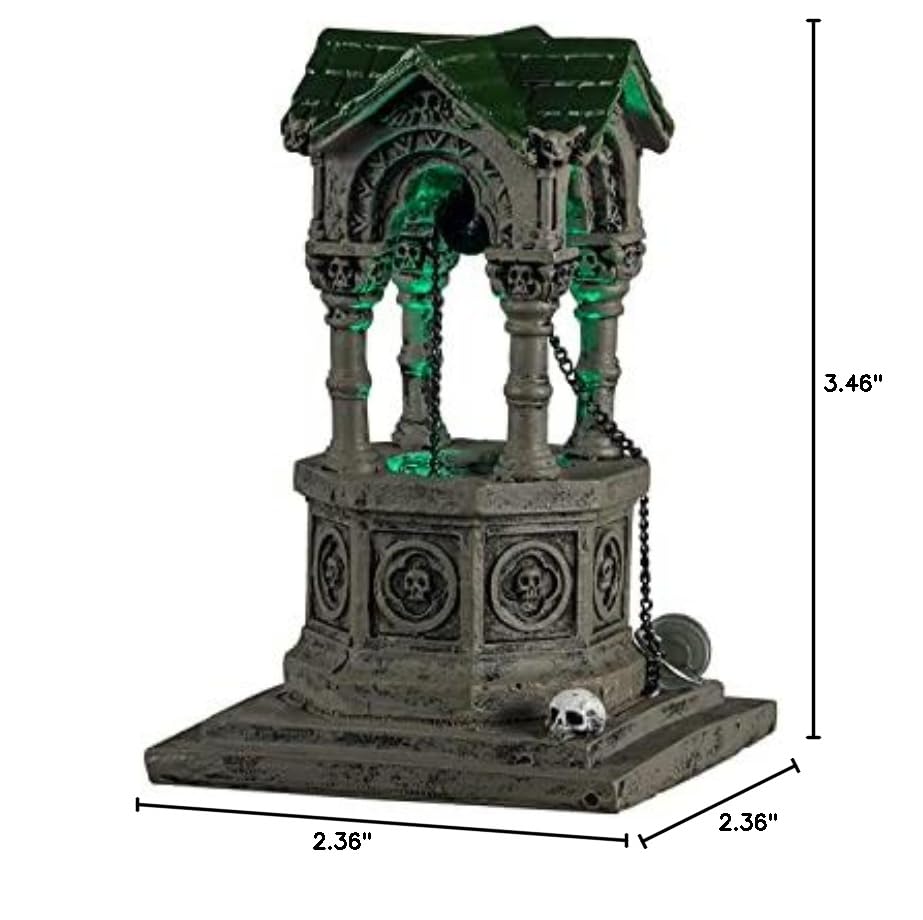 The Gothic Well is a lighted table piece filled with intricate and creepy details. A spooky green light glows from within the well as a chain lowers a bucket into its depths. The entire structure is covered in intricate carved skulls as a human skull sits at its base.