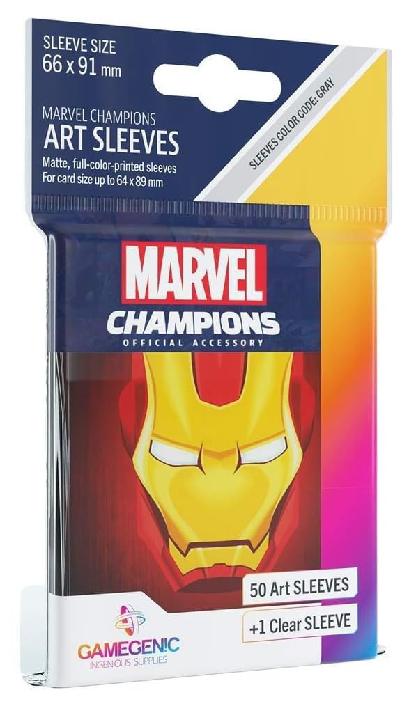- Q: What size are the Marvel Art Sleeves - Iron Man? A: The Marvel Art Sleeves - Iron Man are optimized in size for MARVEL CHAMPIONS and other TCG and LCG card games, measuring 66 mm x 92 mm, making them suitable for all standard-sized card games.