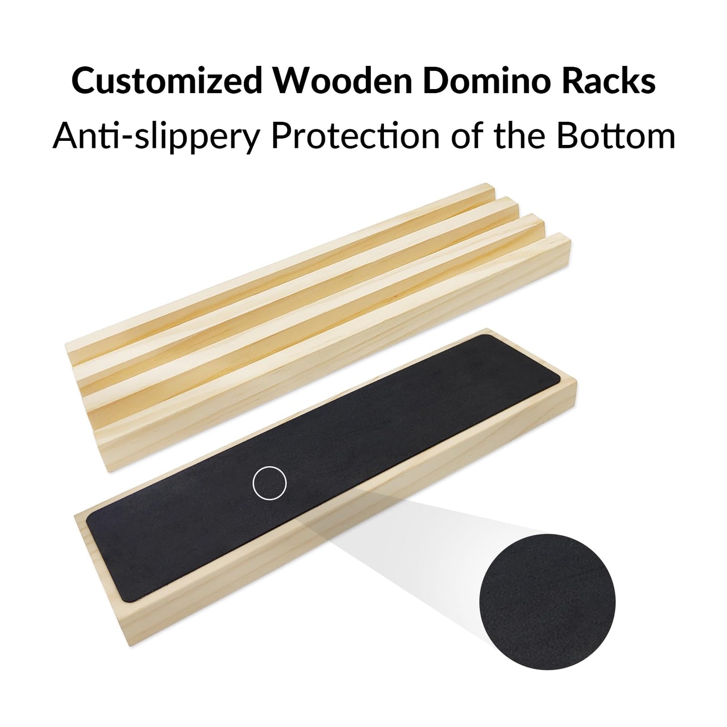 - Q: What makes the wooden racks unique in this domino set? A: The wooden racks are customized for the Mexican Train Dominoes Set, featuring 3 slightly slanted slots and anti-slippery protection at the bottom to keep your dominoes secure during play.