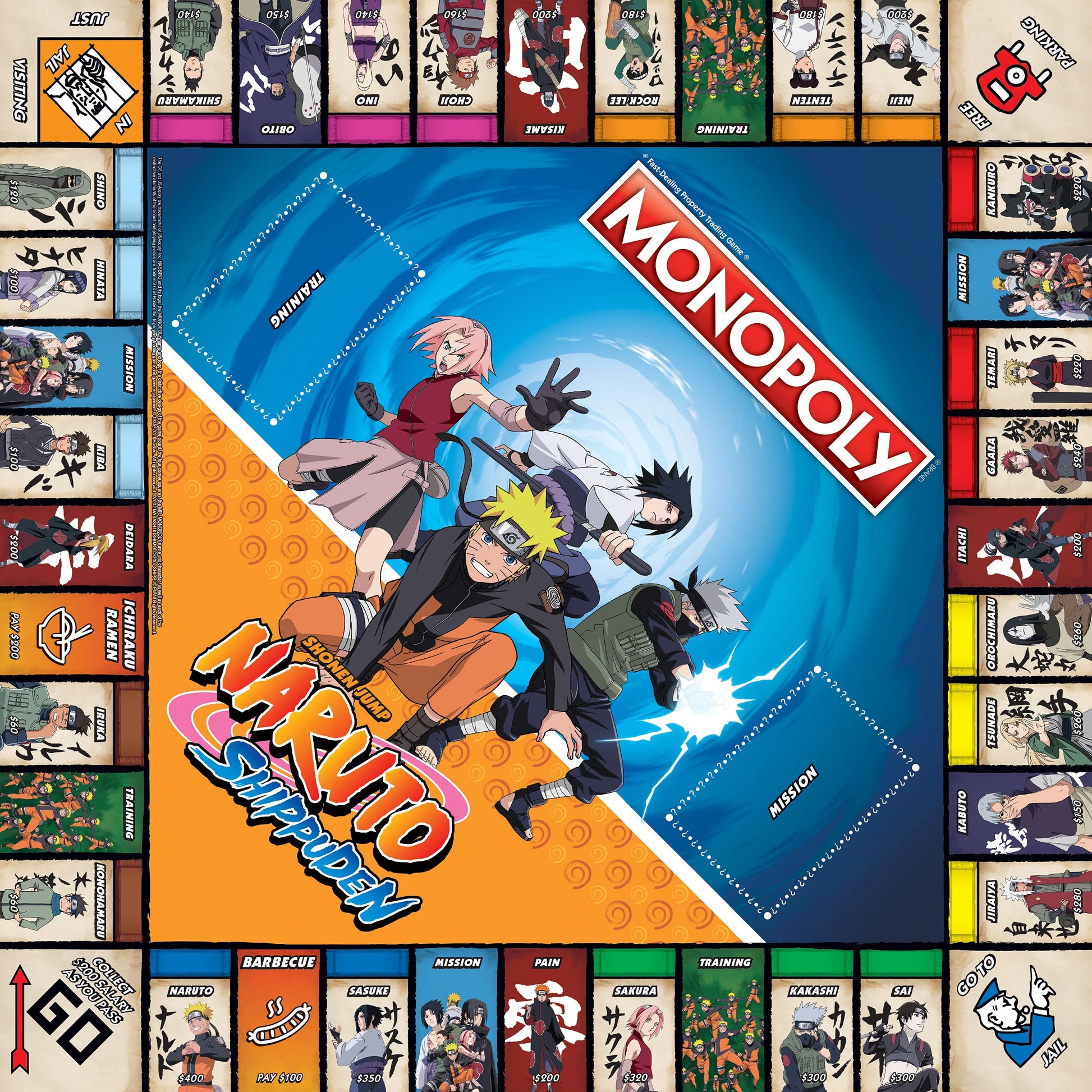 - Q: What unique features does the Monopoly: Naruto game offer? A: Monopoly: Naruto features 6 custom sculpted tokens inspired by the anime, including Gaara's Sand Gourd and Kakashi's Anbu Mask, along with rebranded Chance and Community Chest cards as Mission and Training cards.