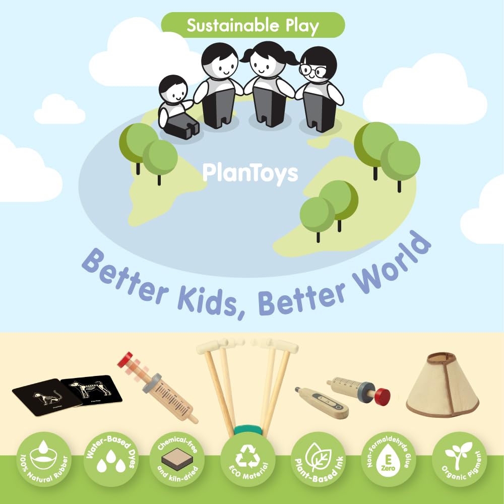 Everything a young animal lover enjoys taking care of their furry friend and the PlanToys Veterinarian set helps them express this empathy for pets. The PlanToys 9 piece Vet Set includes a wooden stethoscope, needle for vaccinations and a vaccine jar, a thermometer, a bandage, collar, 2 x-rays, and a medical bag to store everything in. This Dr. set is sized for preschool hands: the medical bag measures 3.1 x 8.5 x 5.7 inches. The Vet Set encourages imagination and creativity through role play. The Vet Set also helps children to develop empathy and kindness towards animals, both real animals and their stuffed toys. Suitable for budding vets and all animal lovers 3 years and older. The toy designers at PlantToys craft fun products which encourage all aspects of a childs development including gross and fine motor skills, language skills, social development and interaction, and much more. All PlanToys classic wooden toys are made from rubber wood trees which no longer produce latex. The rubberwood used is free of chemicals and is kiln dried to assure it remains chemical free. Their toys are assembled using a certified E-Zero formaldehyde-free glue. Organic pigments and water-based dyes are then used to add color. A PlanToys toy is safe for your child, and assures a sustainable environment for their future.