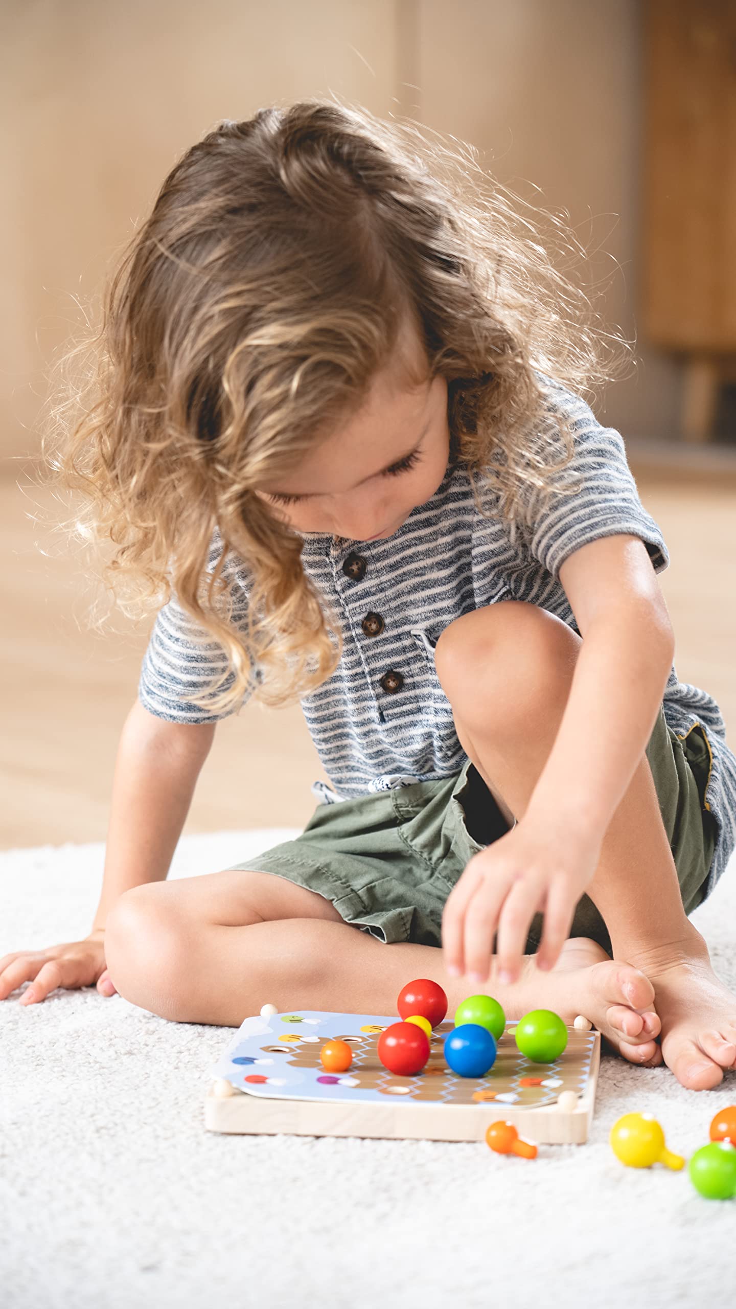 PlanToys wooden Creative Peg Board will keep children entertained and help develop fine motor skills at the same time. The set includes a rubberwood peg board with 25 holes and measuring 6.9 x 6.9 x .5 inches. There are 6 scenes on the three double sided cards which children can follow to complete the scene. Alternatively, kids are encouraged to create their own imaginative patterns. 25 colorful, wooden pegs are in two sizes to add another challenge and fun times. At PlanToys, our mission is to provide children with sustainable, eco-friendly toys that encourage early learning, fire the imagination, and stimulate the senses. Our toy designers craft fun products which encourage all aspects of a childs development including gross and fine motor skills, language skills, social development and interaction, and much more. All PlanToys products are made from rubber wood trees which no longer produce latex. The rubberwood used is free of chemicals and is kiln dried to assure it remains chemical free. Our toys are assembled using a certified E-Zero formaldehyde free glue. Organic pigments and water-based dyes are then used to add color. A PlanToys toy is safe for your child, and assures a sustainable environment for their future. Suitable for children 3 year and up.