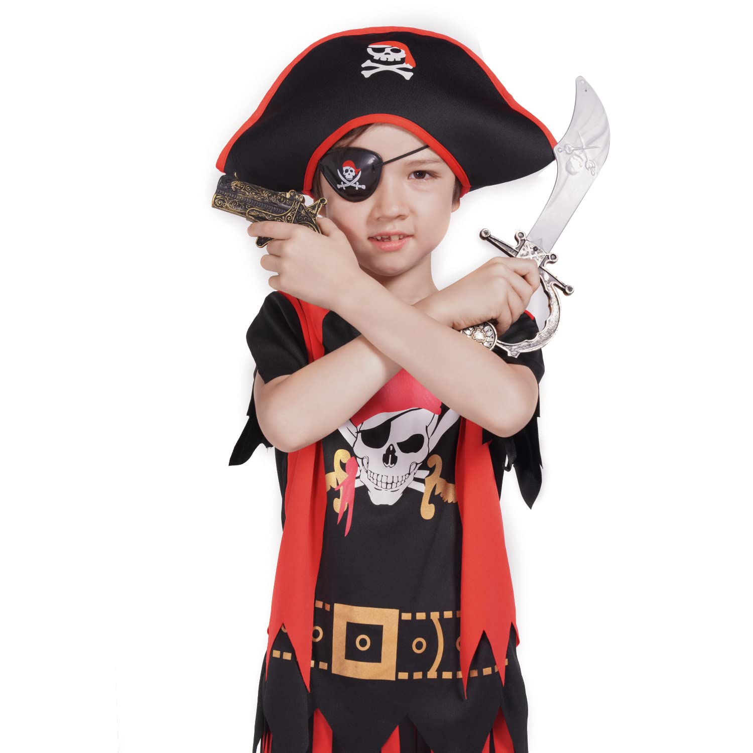 - Q: What is included in the Rabtero Boys Pirate Costume? A: The Rabtero Boys Pirate Costume includes a pirate top, pirate pants, a pirate hat, an eye-patch, a toy gun, a pirate compass, a plastic sword, a pirate adventure map, a pouch with 6 pirate coins, making it a complete pirate outfit with plenty of accessories for imaginative play.