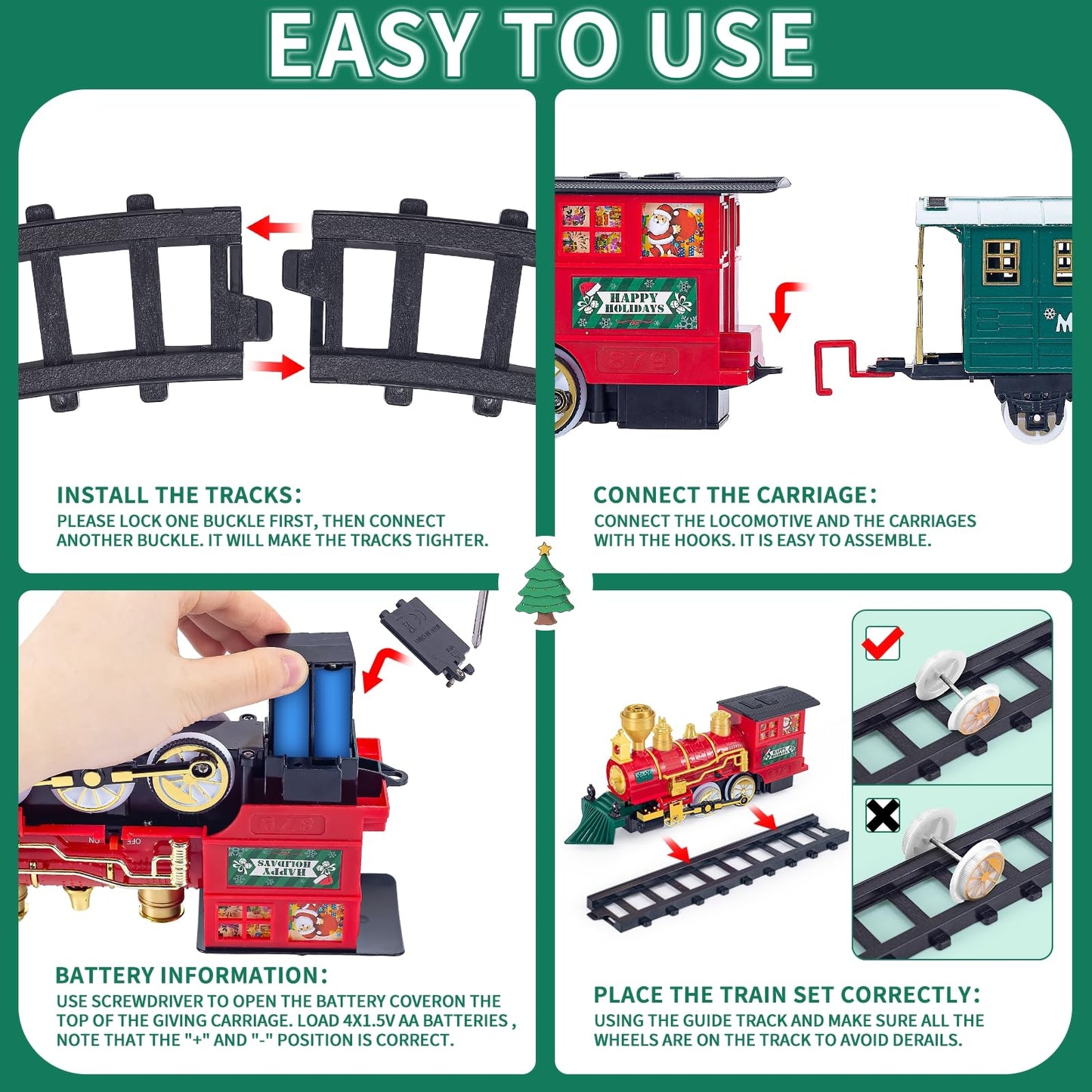 - Q: What type of batteries does the train locomotive require? A: The train locomotive engine requires 4 AA batteries (1.5V), which are not included with the set, so please ensure you have them on hand for operation.