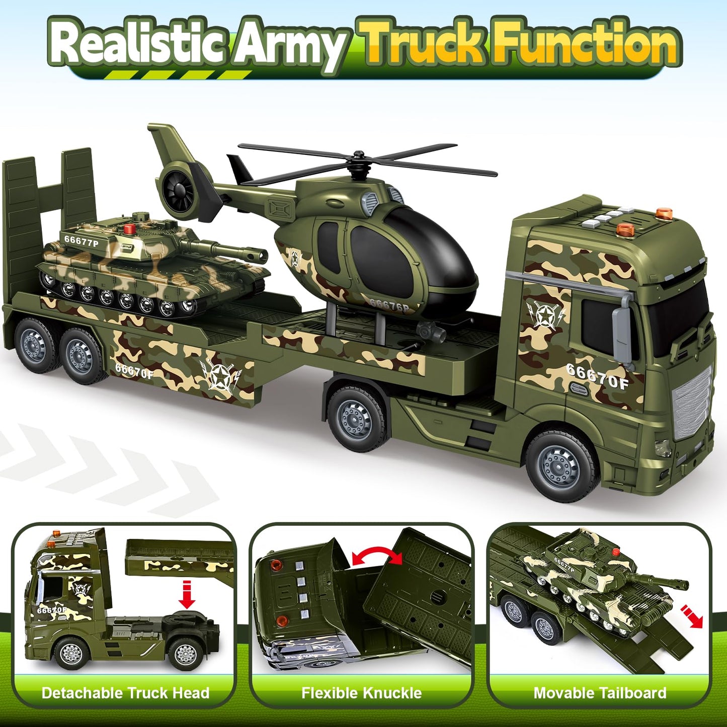 SpringFlower Toddler Boy Toys, 3 in 1 Large Army Truck Toy with Helicoper and Tank, Military Transport Truck Toy, Christmas Birt